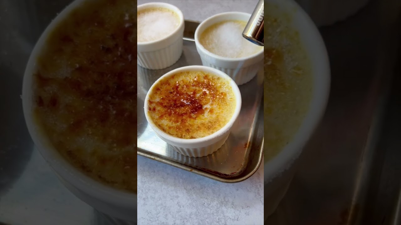 I’m a professionally trained savory chef, but I do love making a good creme brulee. I’m professionally trained in burning stuff, and I do too love a creme brulee. You take two cups of cream. I take two cups of cream. Pinch of salt, vanilla, pinch of salt, vanilla. Bring that up to a simmer and let that steep in there. Bring that up to a simmer and whisk around with the lick spoon. Five egg yolks, 1/2 cup of sugar, five egg yolks, half a cup of sugar, cream, a little bit at a time. If you add it too much at once, it will scramble. Very slowly, we’ll pour the hot cream into the eggs a little bit at a time. Ramachins and put that in a dish with boiling water halfway up. The mixture into ramicans and boiling water halfway up. Bake at 325 for 40 minutes until it wiggles like this. Bake at 325 for 40 minutes. It’s only been 20 minutes. Why is it looking so brown? Set overnight and then top with some sugar and either blowtorrch it to caramelize or place under a broiler for about a minute or two. Set overnight and top with sugar. Torch it till it’s a little bit charred. It’s called brulee. All right, guys. Give me a break as I will give to this. It’s actually so smooth and creamy, you don’t even taste that brown stuff on top. The bitterness serves as a contrast. You know what I mean? It’s really easy to make. 9.2 out of 10. All right. Thank you.