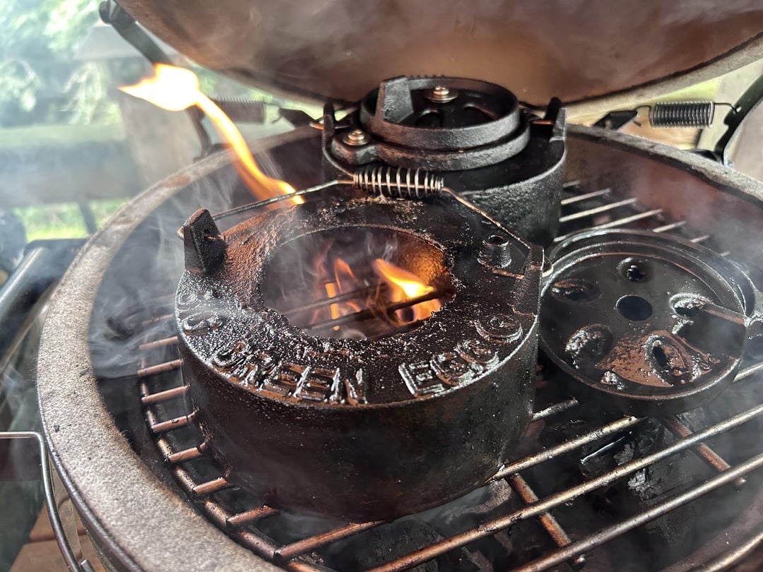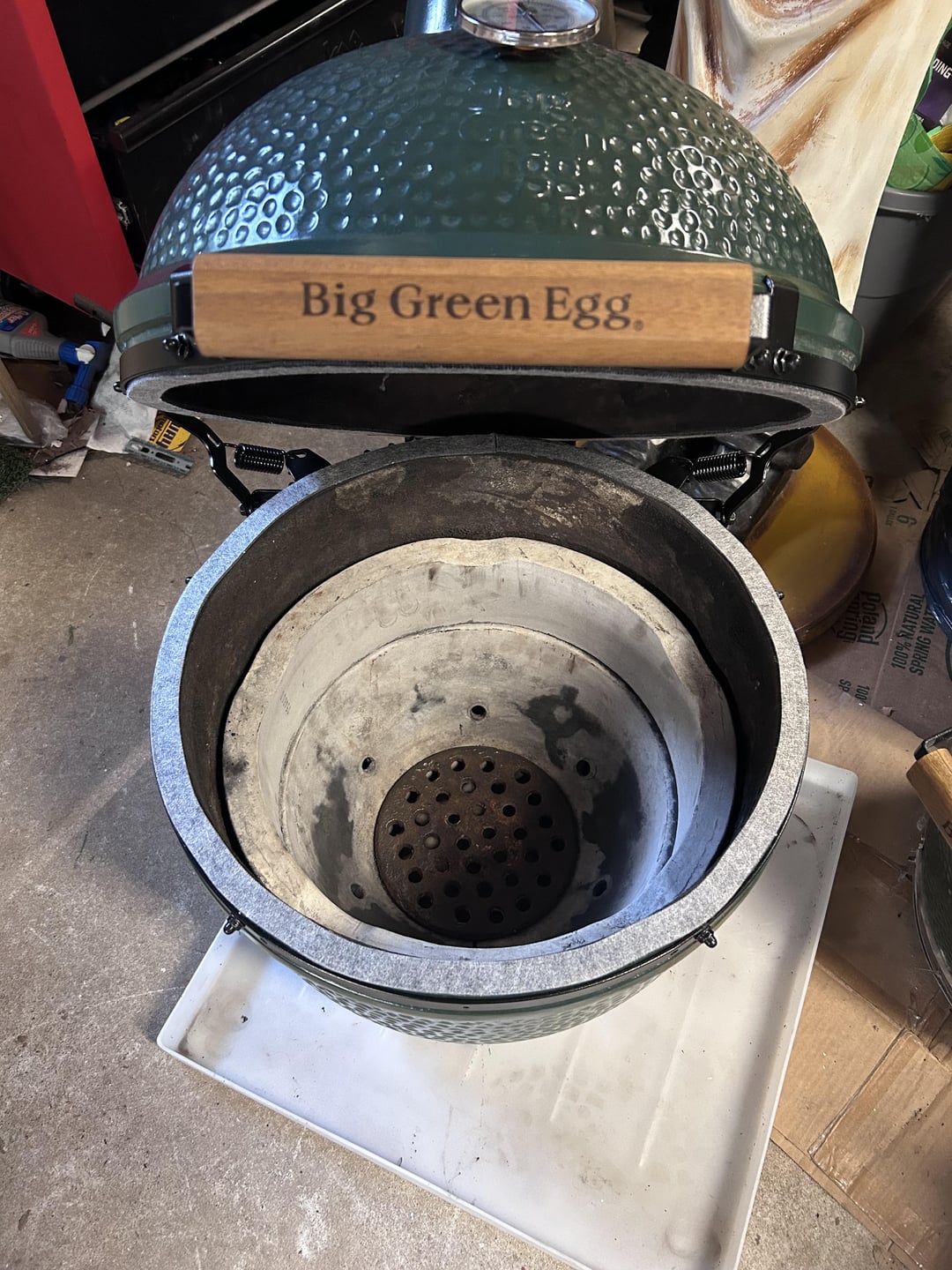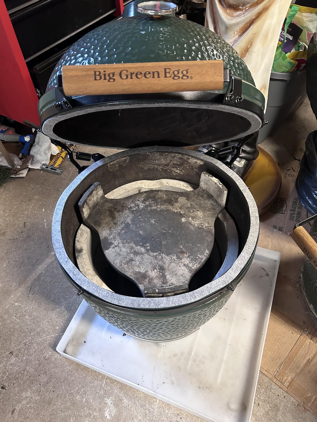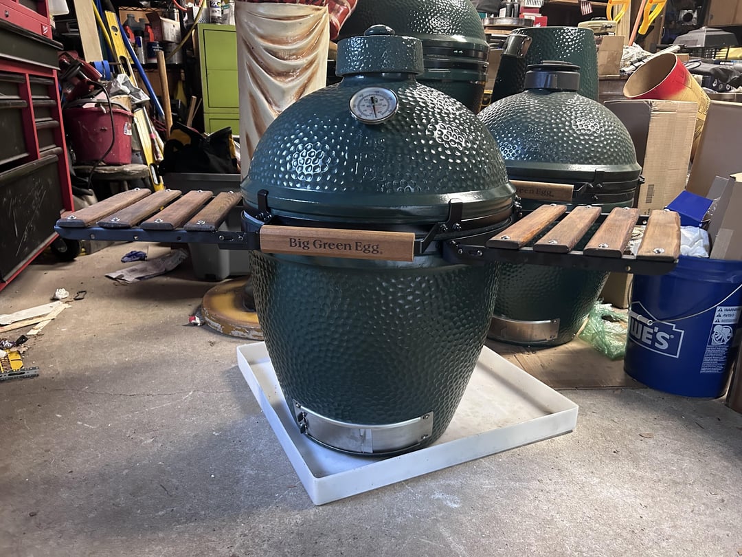 Backstory time, months ago I picked up a Large Egg with neat and Eggmates that had a crack in the base for a couple hundred bucks. My plan is to fiberglass and insulate the inside of the basement and make it into a beer cooler to match my eggs (I planned to post that once I get to it). I planned to keep the fire box and ring as spares to my large just in case and tossed the mates aside in my garage as they were nasty. I did a clean burn to clean off the internal parts and set everything aside.