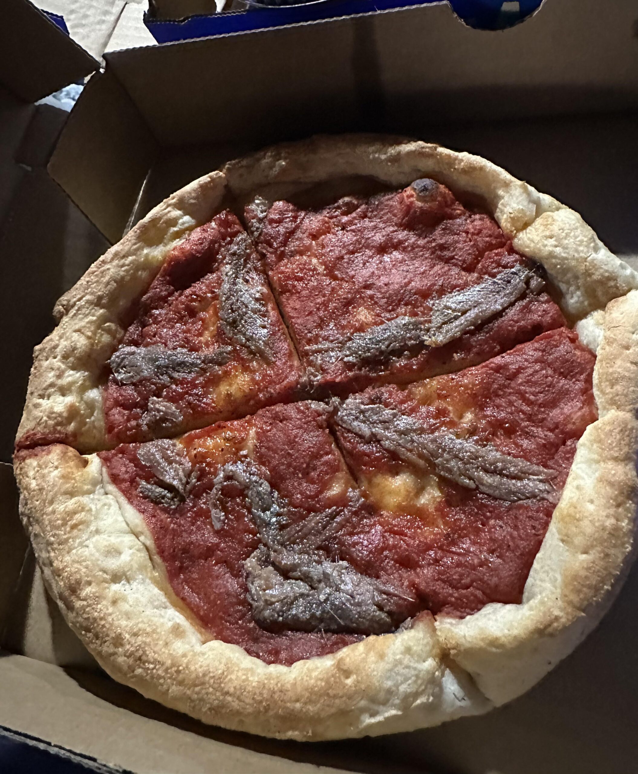 Anchovies on pizza are bomb. If you’re going to skip everything else both they and the sauce better be particularly good, though. Also I prefer mine put cold on a hot pizza. The temperature and salinity both contrast really well with a hot, sweet-sauced pizza.