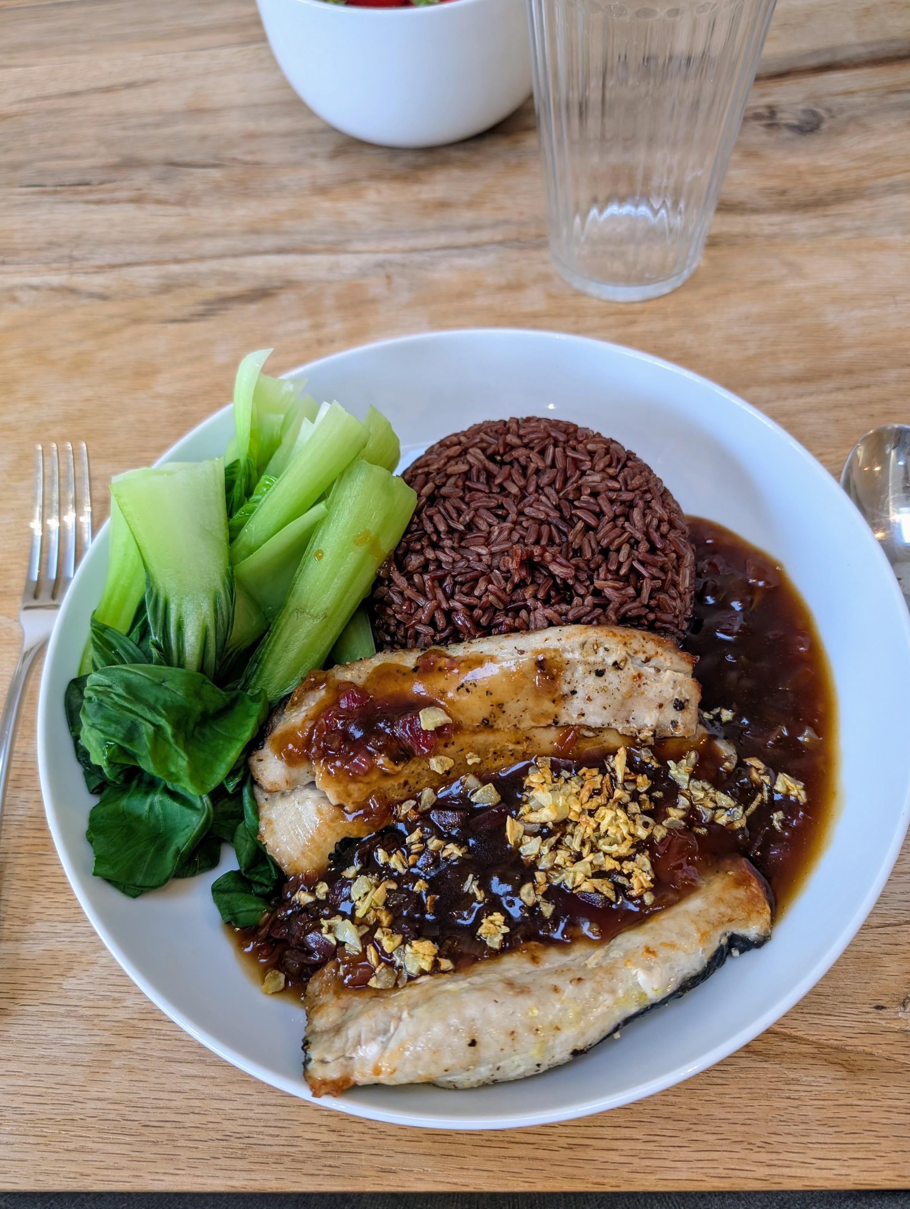 Red rice and pak choi are self explanatory, but to make the bangus, I just brushed it with oil, and seasoned and air fried at 200C for 15 mins. Meanwhile, I fried 8 cloves of garlic in a bit of cold pressed rapeseed oil, removed once crispy, and then fried a red onion in the same garlic infused oil. I then added 1/4 soy sauce, 1/4 water, 1 tablespoon oyster sauce, 3 tablespoons of lime juice (would be calamansi in the Philippines but I can’t really get calamansi here) and 1 teaspoon of brown sugar and let is simmer for 5 minutes before thickening with cornstarch. I served it all with the crispy garlic sprinkled on top.