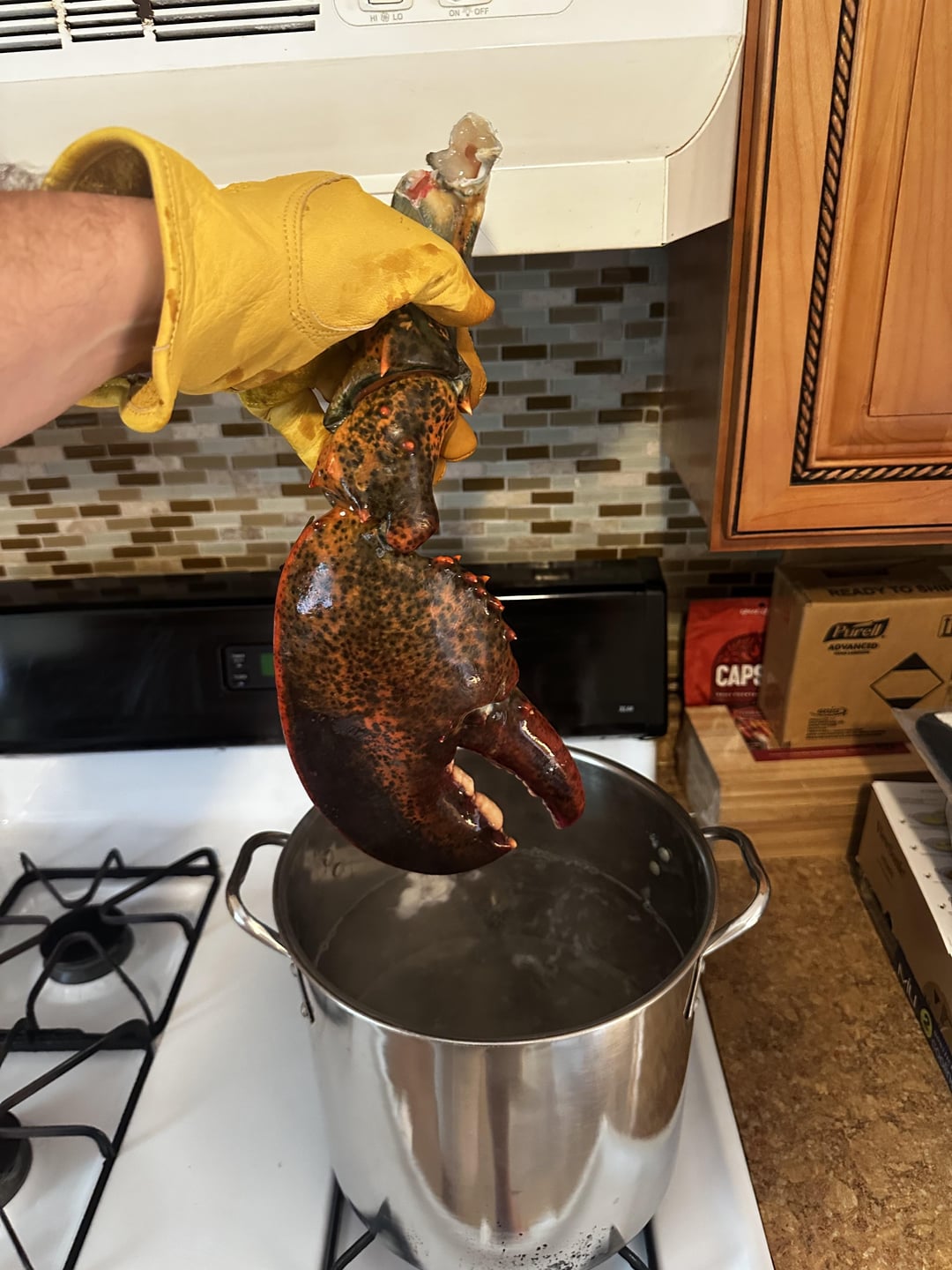 I humanely stabbed the brain the second I opened the box. The creature didn’t fit in my turkey stock pot – again, that’s a turkey stock pot. I ripped the tail off that continued to curl reflexively whenever I stuck kebab sticks in to keep it straight. I ripped the claws off using some big yellow gloves I use to stack wood, a hammer, a kitchen shear and a meat tenderizer.