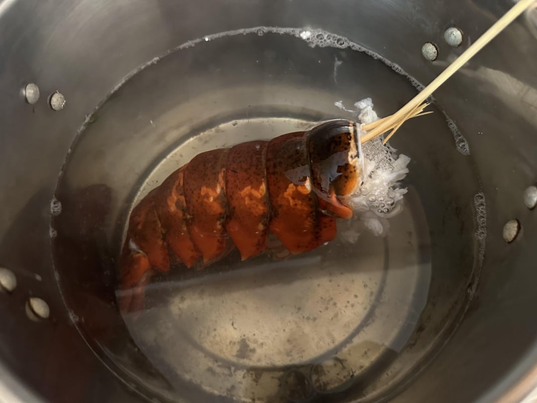 I parboiled tail for a minute and the claws w knuckles for 5 min each. I then put the remaining carapace with little legs in for ten minutes for presentation.