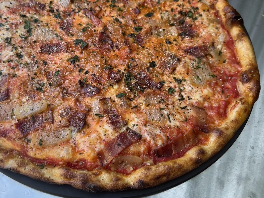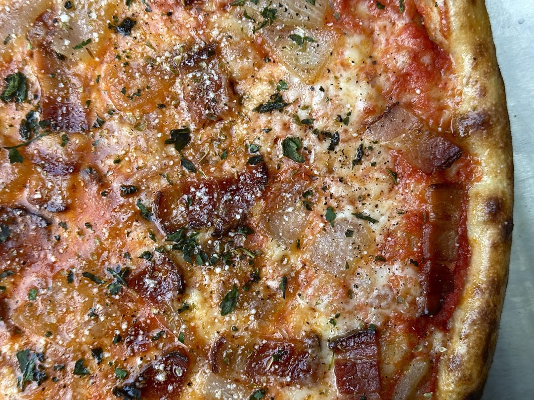 Pizza night! This week’s special is one of my all-time favs. It had a Mozzarella and smoked Scamorza mix, tomato sauce, bacon, sautéed onions, and grated Pecorino Romano