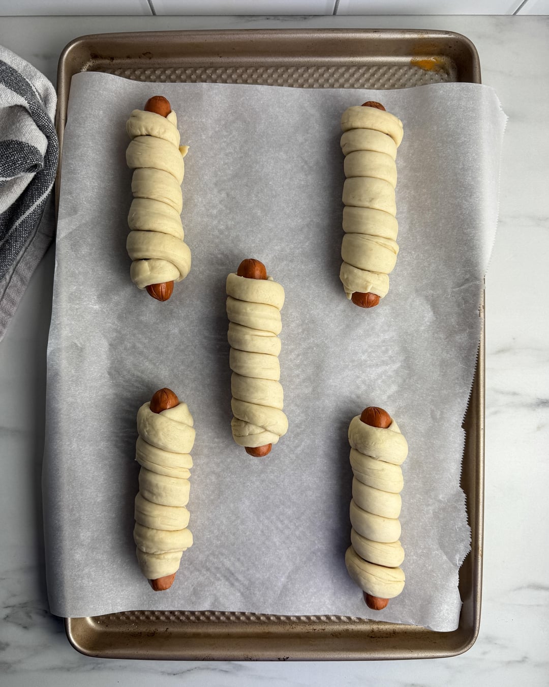 4. Remove the hot dogs from their packaging and pat them dry with paper towels to remove excess moisture. Gently wind a dough piece around each dog. I like to press the ends of the dough rope flat with my fingers, and tuck them under the rope as it’s wrapped around. This helps them hold their shape a bit better as they bake.