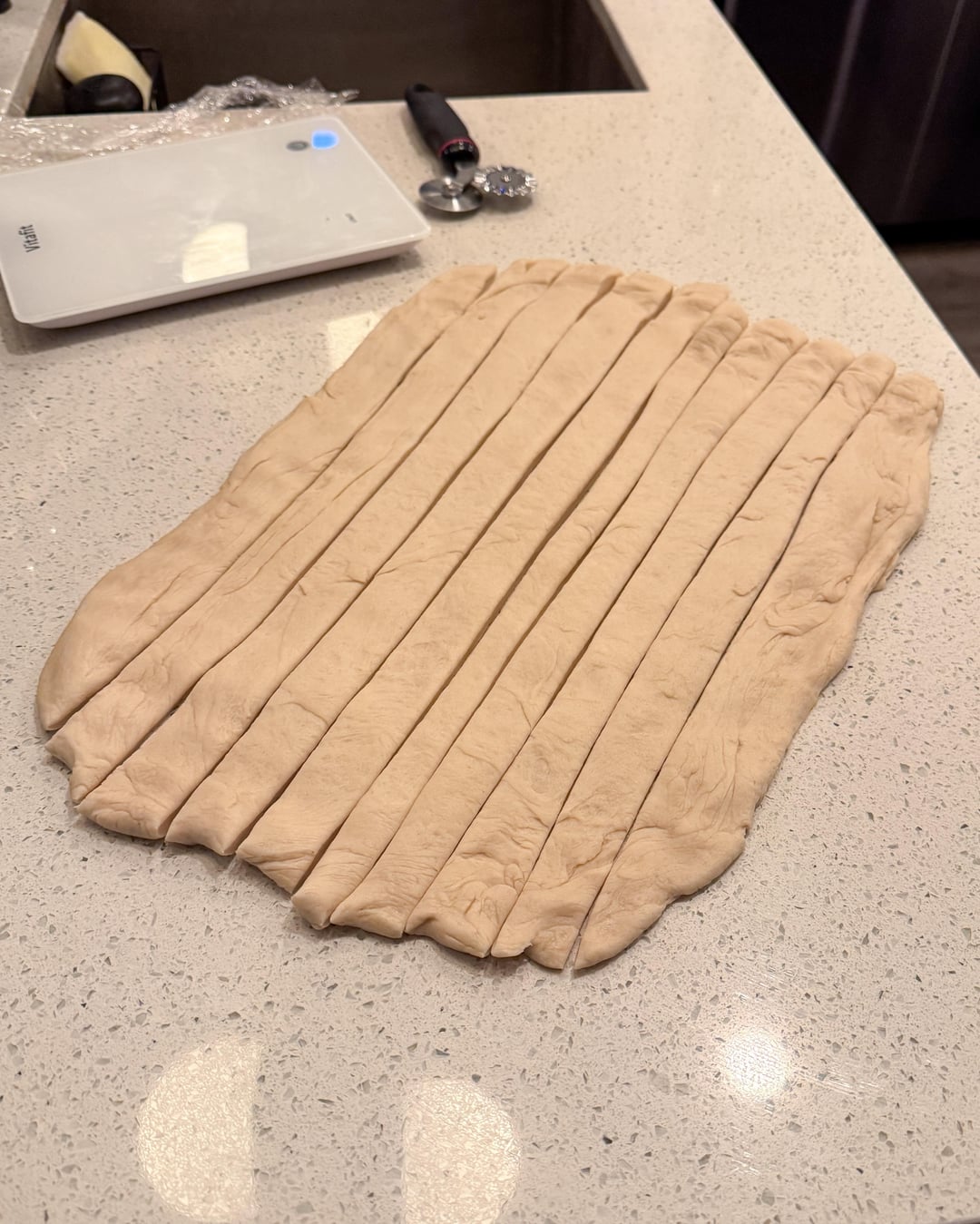 2. Turn the dough out onto a clean, smooth surface (I use my countertop) and divide into 10 equal pieces. Rolling the dough out into a sheet with a rolling pin, and cutting it into strips is an easy way to do this. You can also divide the dough into 10 pieces, then roll each one out.