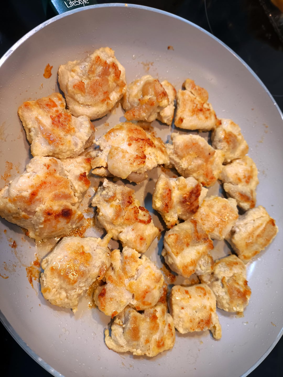 3. Fry the chicken pieces with 1- 2 tbsp oil in the frying pan with medium heat until golden brown on both sides.