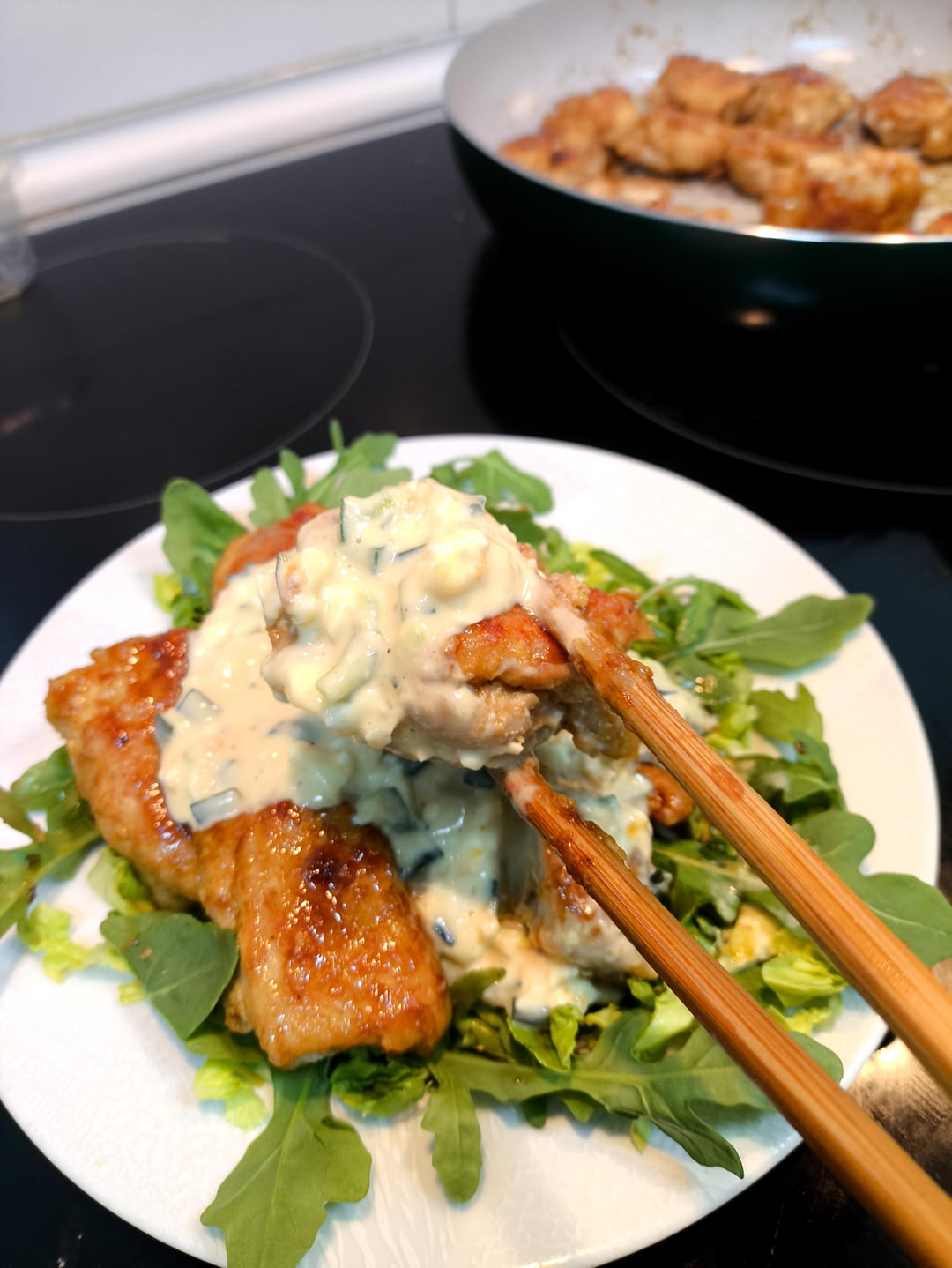 It tastes amazing over a bed of shredded lettuce, I personally love to add a handful of arugula, its slight bitterness and nuttiness match perfectly with the tangy sweet chicken nanban, creates vibrant layers of flavors.