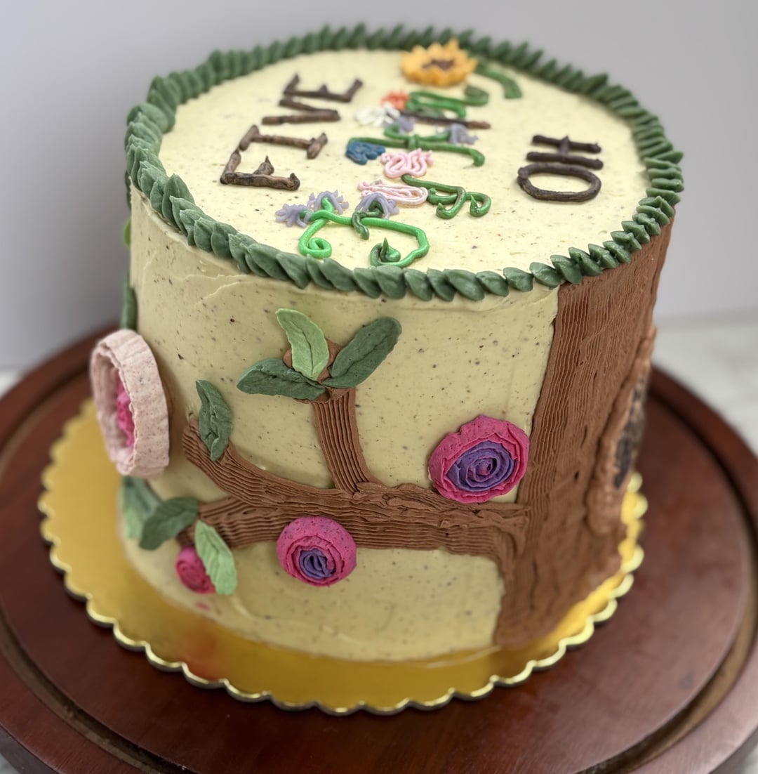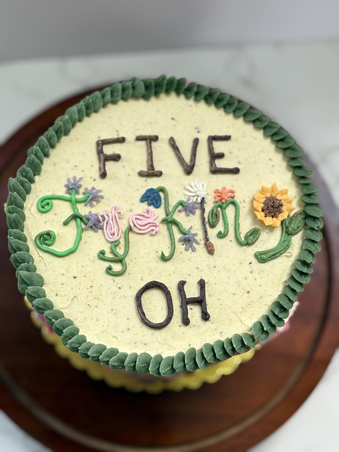 3-layer pistachio cake & pistachio buttercream with chocolate ermine and pistachio brittle between layers.