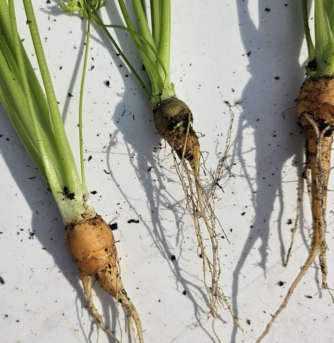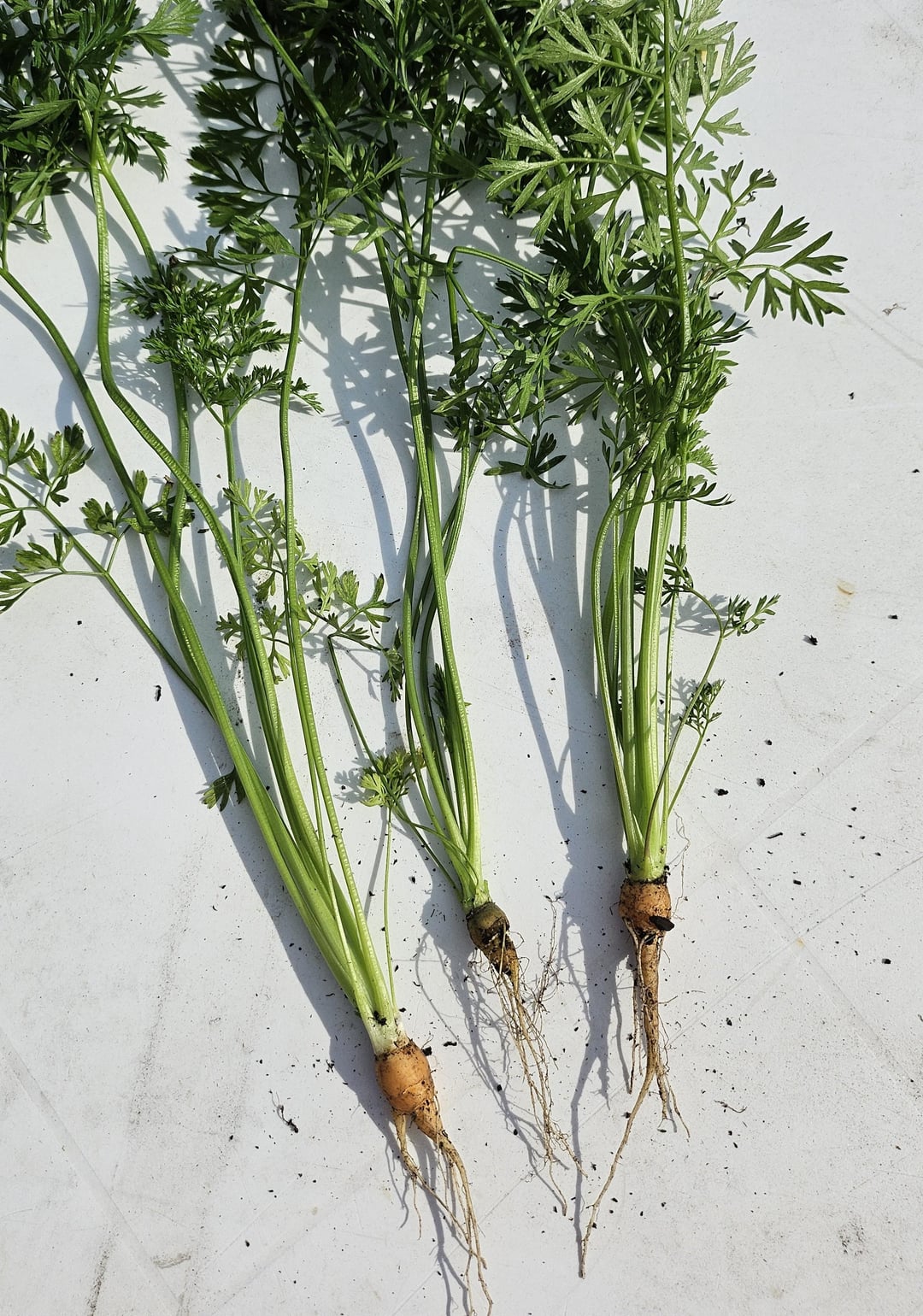 Hmm, i see short carrots but very tall tops. I’m a novice gardener, but nitrogen contributes to leaf growth, while the other two “main ” nutrients contribute more to fruits or roots. All the extra top growth is NOT going into fruit or roots. I made this mistake once as a child and was disappointed because i thought it was doing SO WELL.