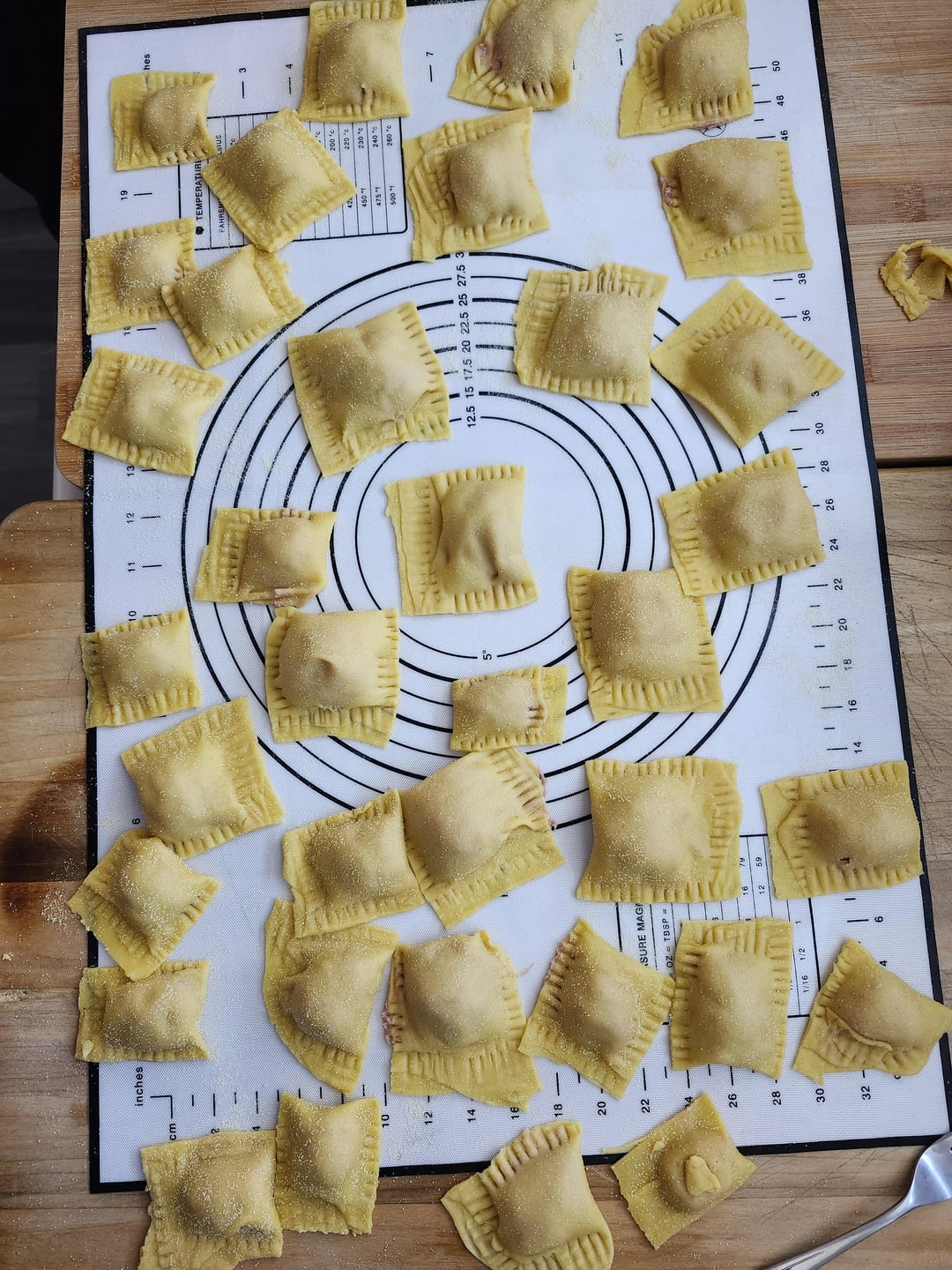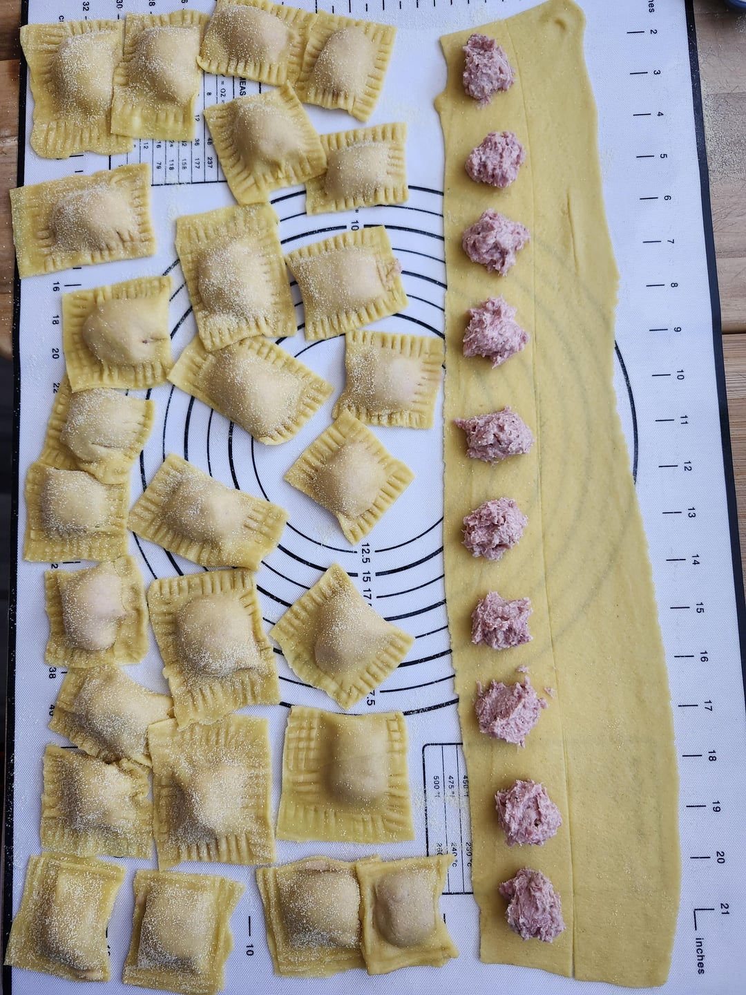 It was an endeavor making the pasta dough, using the wrong flour and ratios making a goopy mess. Ordered some pizza and called it a day. Next day used the normal flour i used in the past to make pasta, following the bag instructions which are always 100% correct. Left it over night wrapped up for the next day. Mixed beef and ricotta for filling. I think did the folding method idk. I swear I did my best to keep them the same size. I had way to much filling left over so i panic made more pasta in 30min. Still had more left over so just mixed it in with the sauce. Garlic bread and some parmesan cheese to top. It was slightly better than frozen pasta. If i do this again ill do meat in frying pan and cheese separate. Any tips would be appreciated! There is so many different recipes and methods.