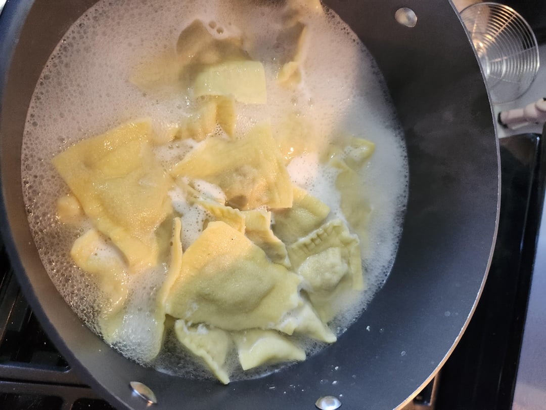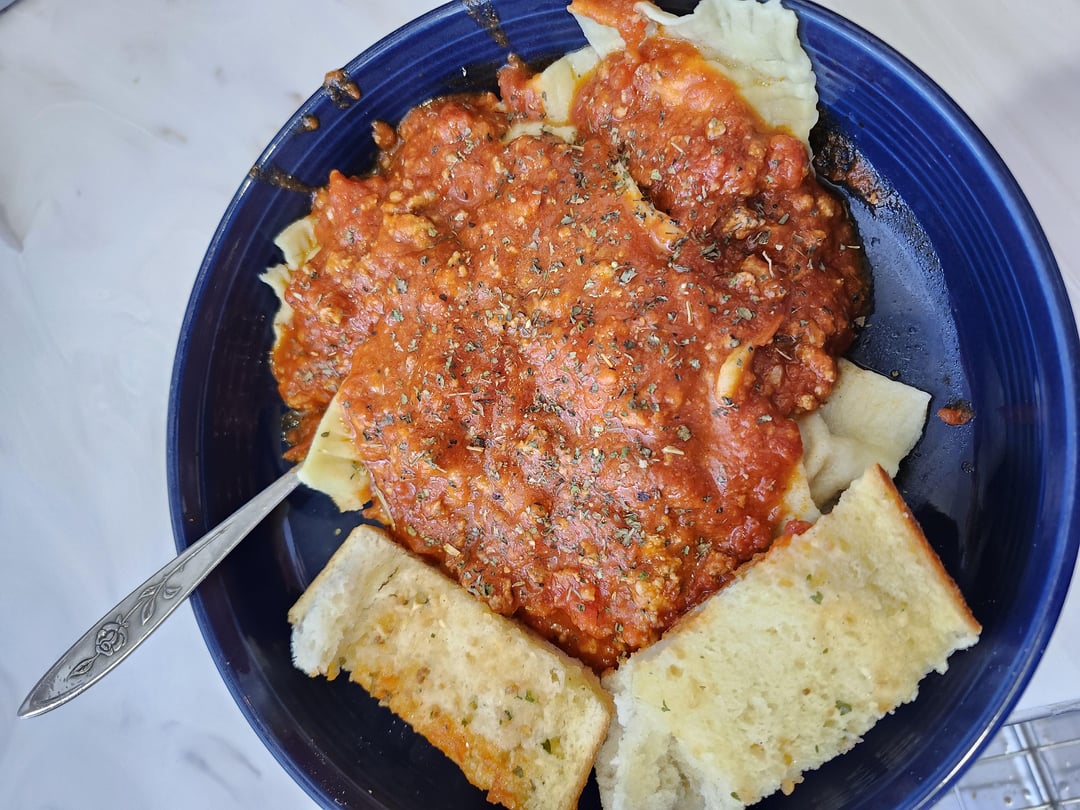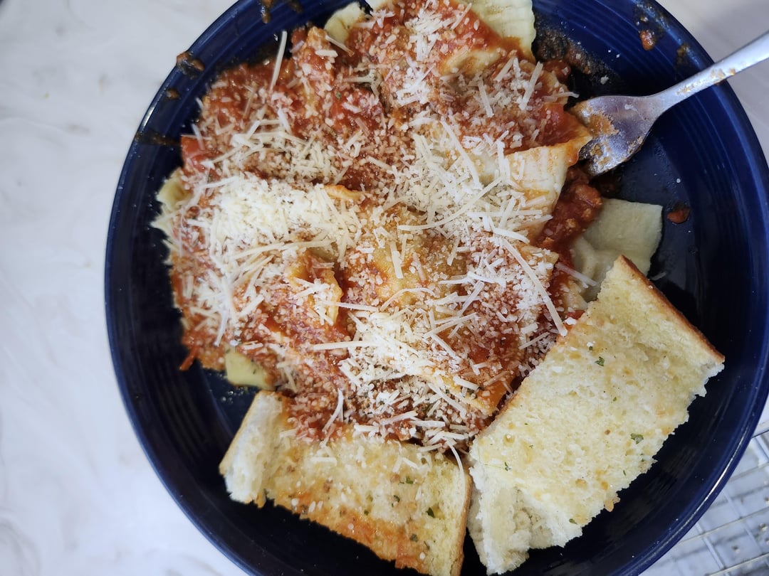 Ravioli looks really good! But… Is that a slice of bread shoved in the middle of your pasta? 😔