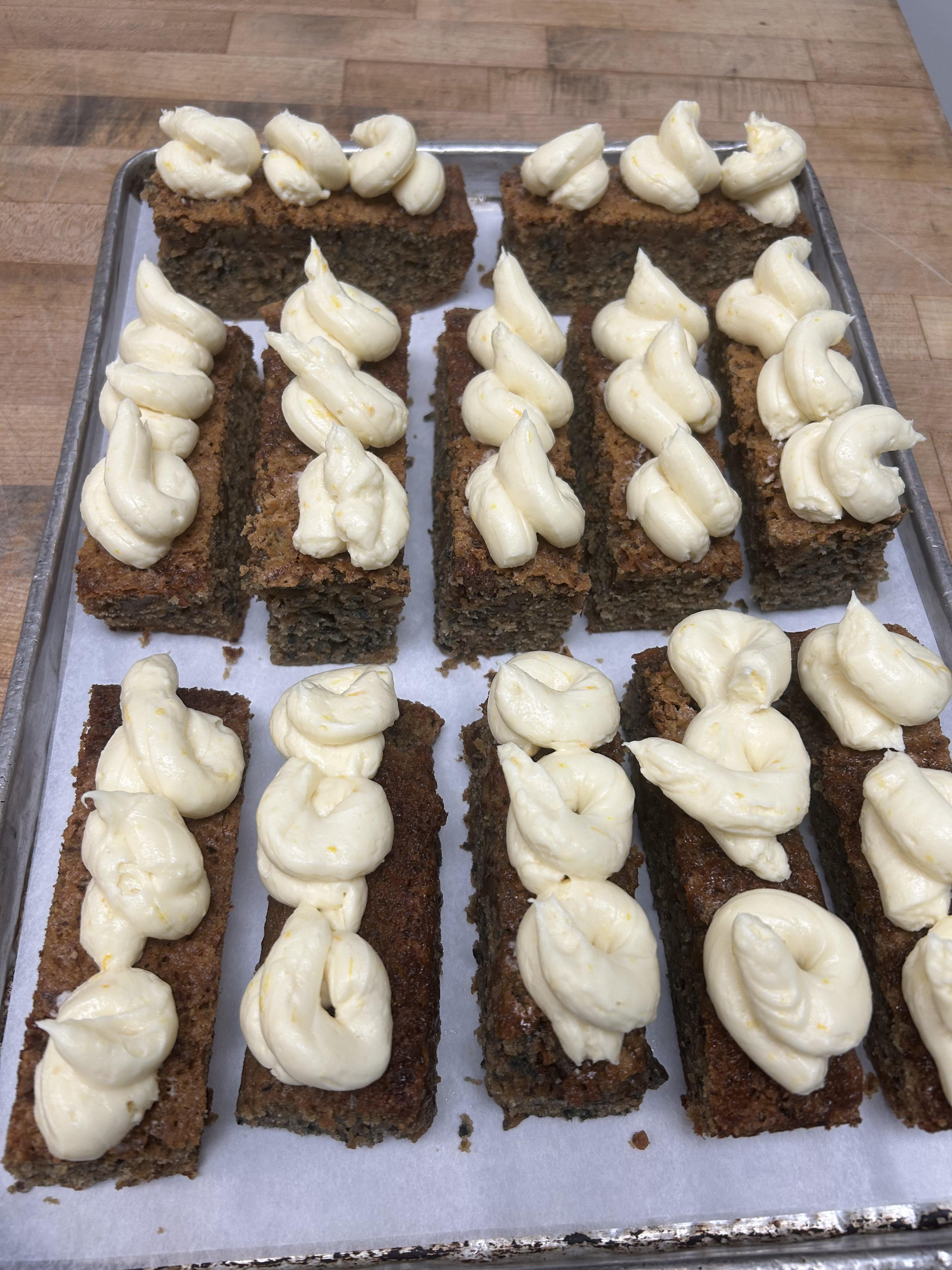These cake bars topped with a delicious orange liqueur infused cream cheese frosting. These $12 at the restaurant garnished with fresh orange zest. Do you like carrot cake?by No-Veterinarian9022 Dining and Cooking