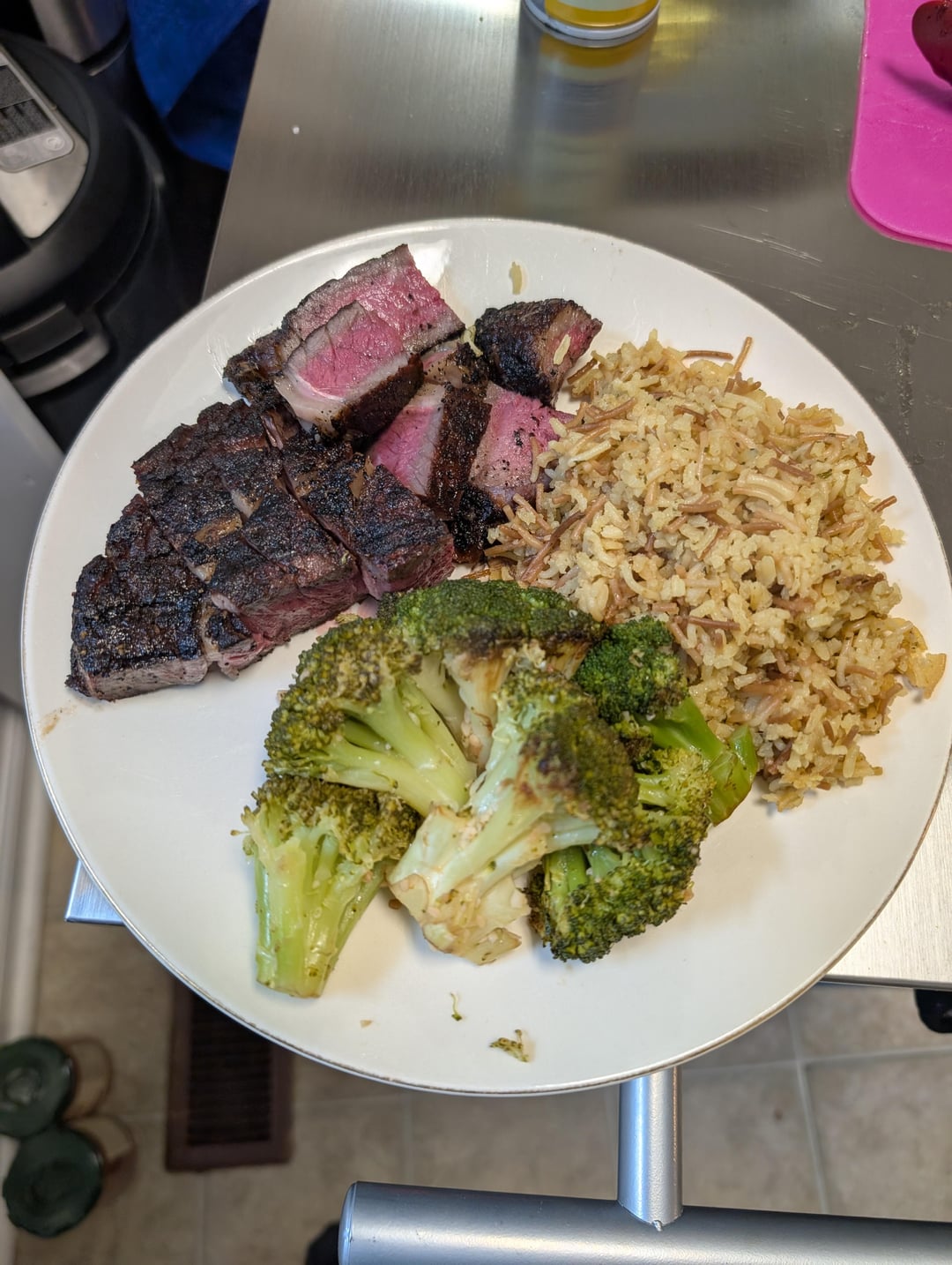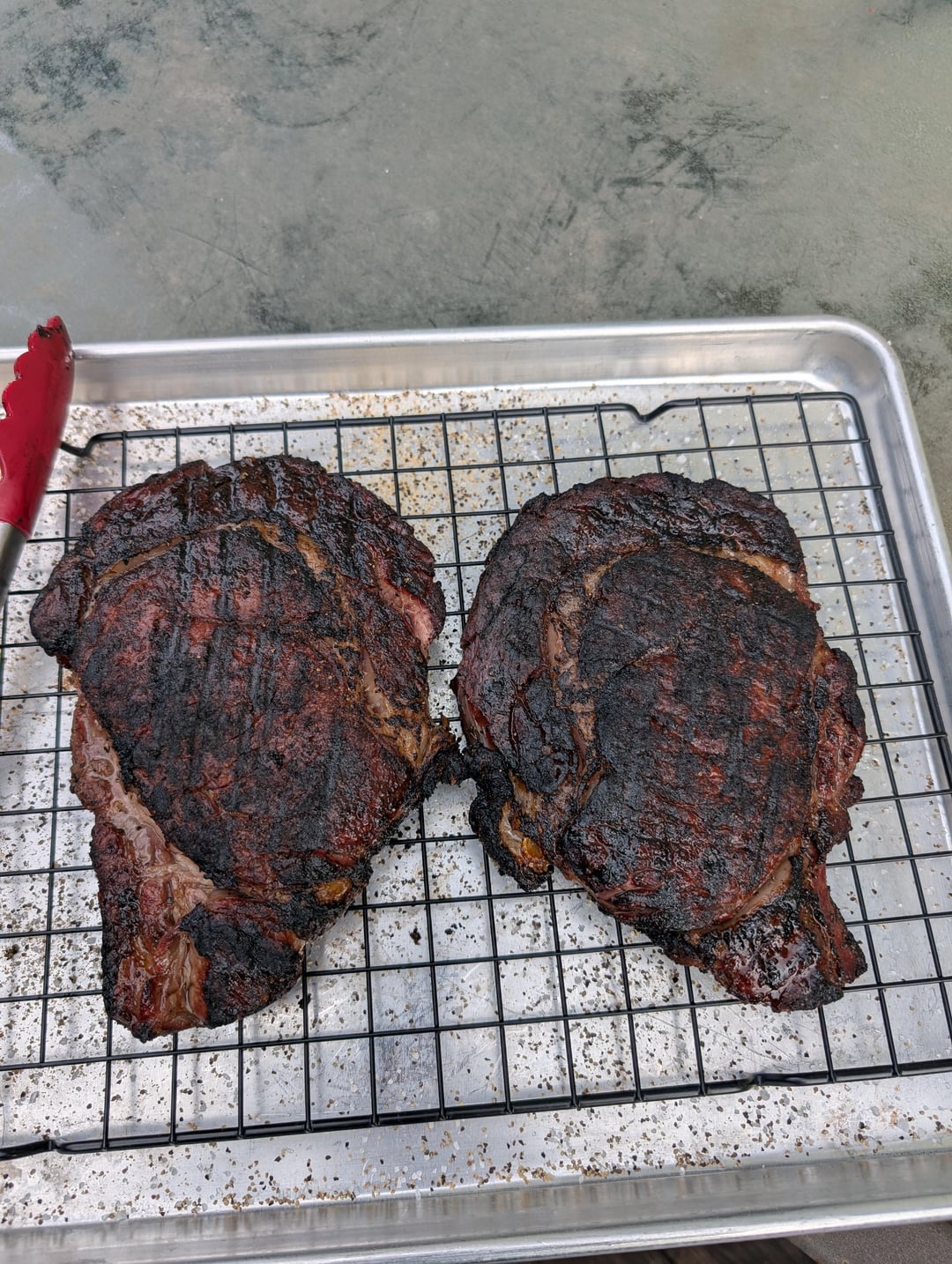 Got some beautiful (Angus Choice, nothing fancy) ribeyes dry brining for 2 days. Grilled them over Jealous Devil until 125 degrees internal. They were large steaks so me and my girlfriend split one instead of eating them both.