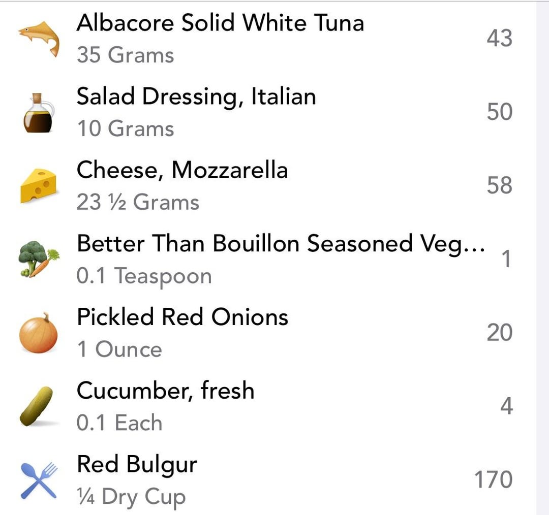 I’ve been really into making grain bowls the last couple months. This one has a base of red bulgur (cooked with low sodium vegetable Better than Bullion), with canned albacore, sliced cucumber, home-pickled red onions and carrots, fresh mozzarella, and a small amount (2 tsp) of Italian vinaigrette. Made with the ingredient amounts I used (in the second photos), this has 346 calories, 20 gm of protein (tuna 10, cheese 4, bulgur 6), and 390 mg of sodium). It was very tasty!