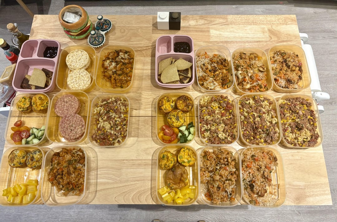 3 boxes on the left are mine, 4 on the right husband’s. i was too lazy today to think about snacks so it’s just rice cakes🤣