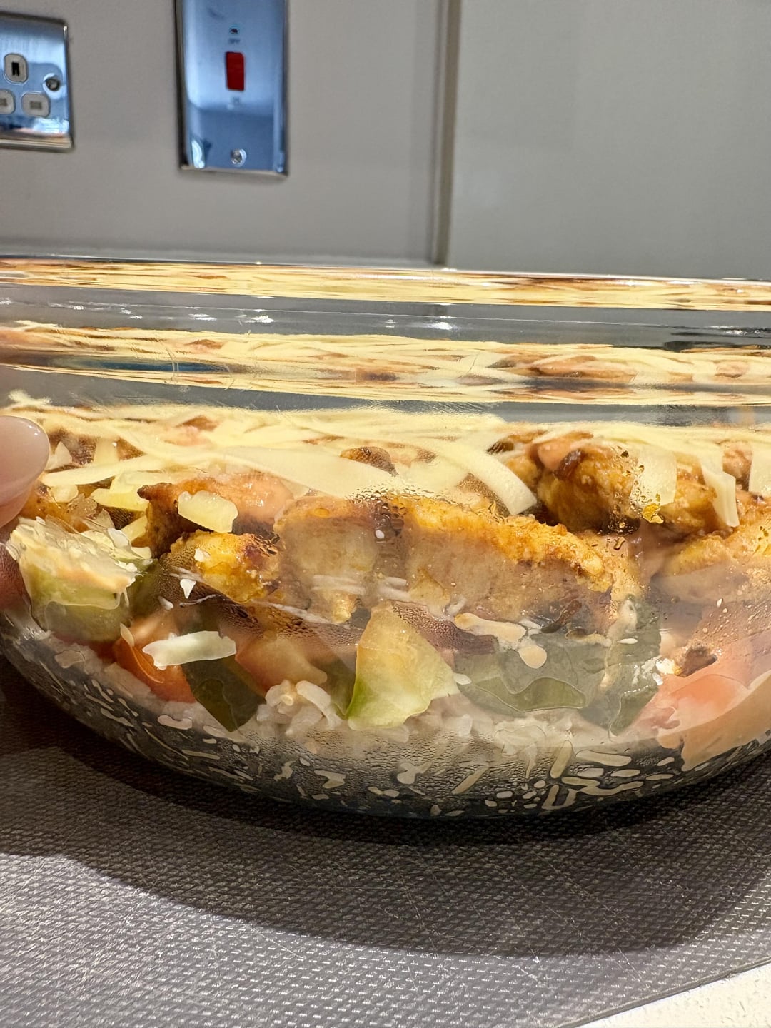 cooked rice, fried chicken with onions, peppers, pickles, mayo and ketchup, grated cheddar