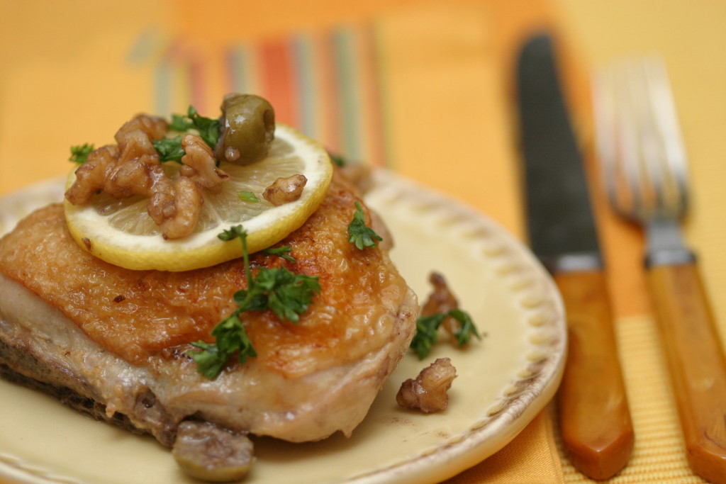 - When chicken is almost done, place sliced lemon on it, and cook 2 to 3 minutes more. Arrange chicken and lemon on a platter, and stir walnuts into sauce. Taste, and adjust seasoning, then spoon sauce over chicken. Sprinkle with parsley, and serve.