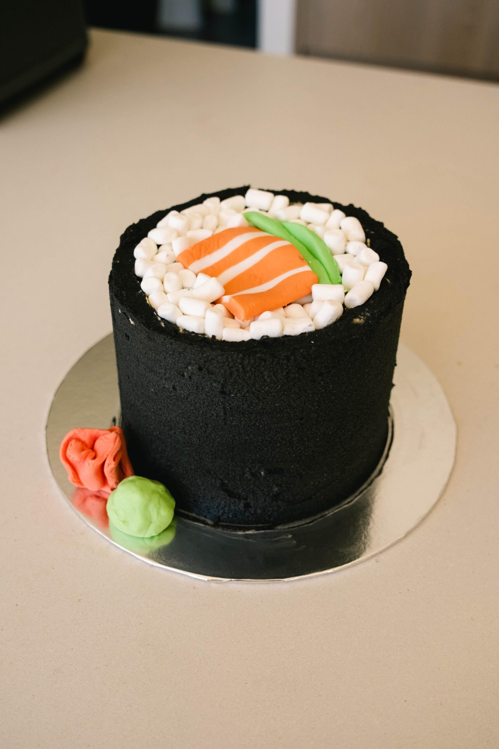 My son loves sushi and the sushi train – he asks to go every weekend! So I baked a sushi cake.