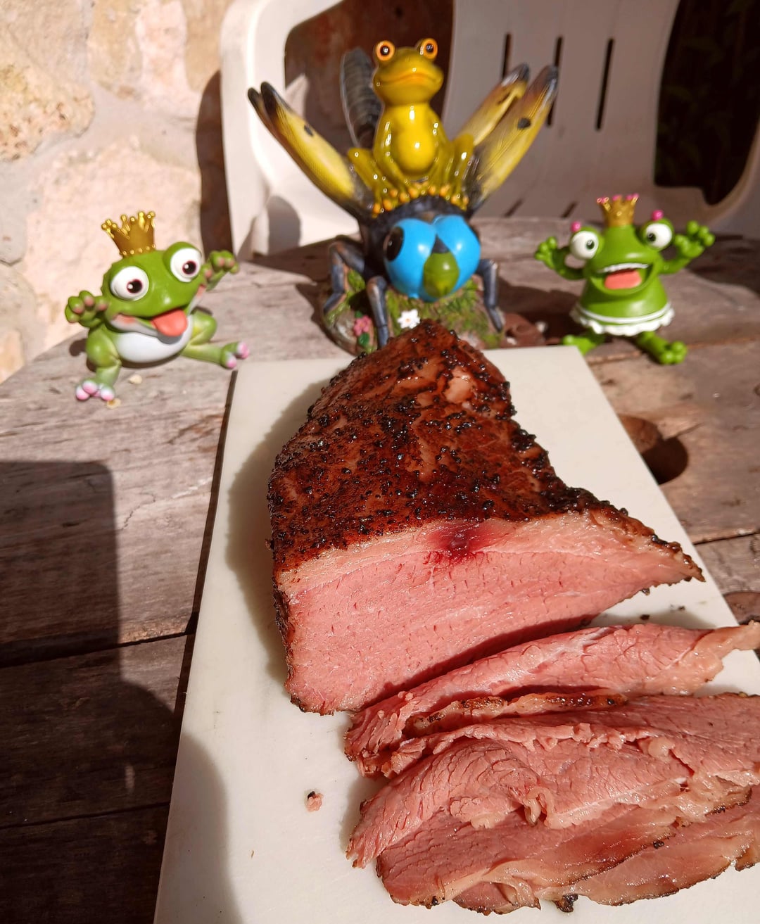 2.66lb USDA Choice tri-tip dry brined with post oak smoked salt, pink salt #1, coriander seed, and crushed black pepper for three days. Sous vide at 133F for 23 hours, and then hit with a very powerful torch to sear – maybe 12 seconds in all.