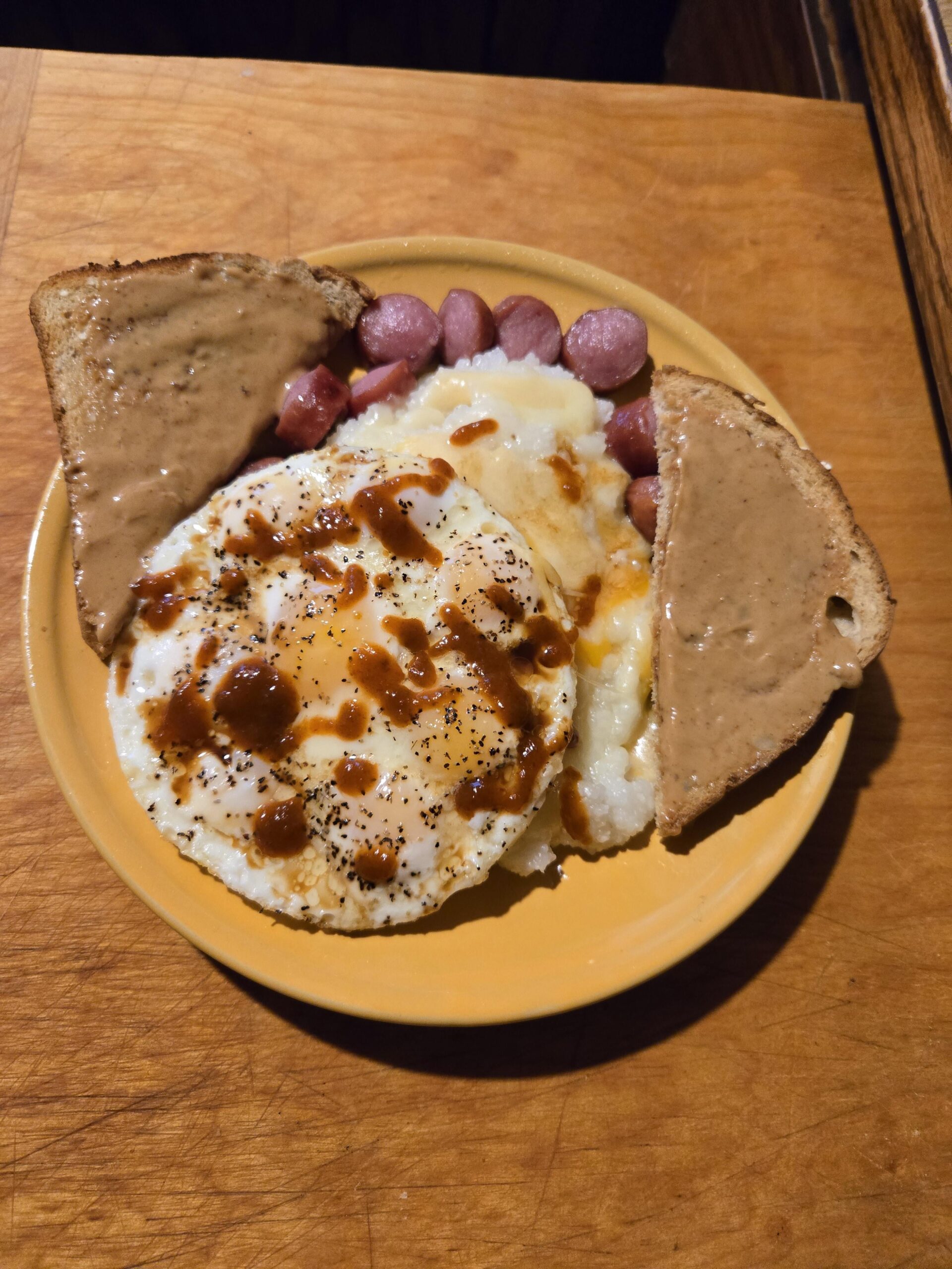 A hearty Friday breakfast! Quail eggs on cheesy grits with sliced sausage and peanut butter toast. Delicious!!by Sure-Entrepeneur219 Dining and Cooking
