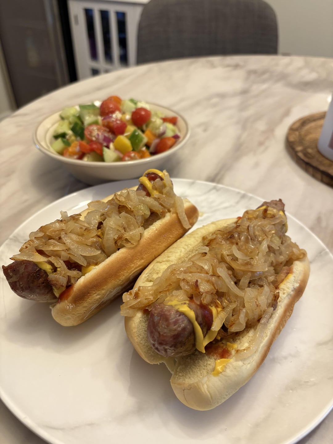 Quick, simple, delicious. Topped with ketchup, mustard, and sweet onions.