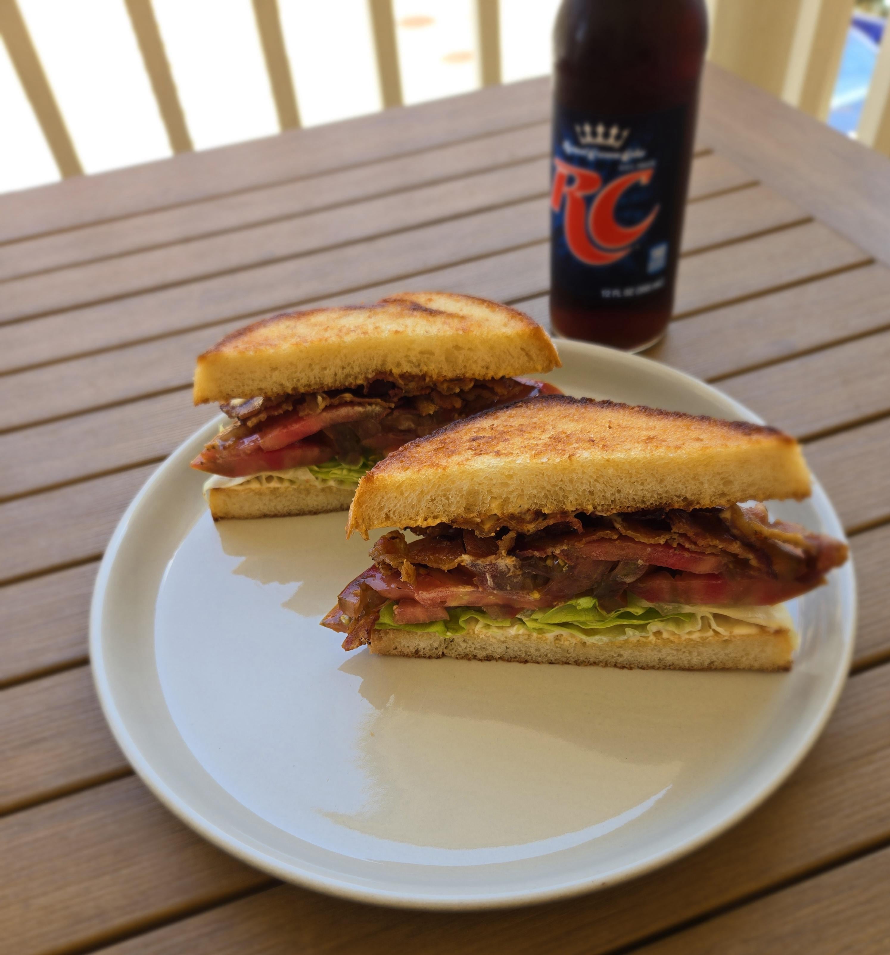 Just a BLT on thick-cut Pullman bread that's been mayo griddled on both sides, pepper bacon, sliced and seasoned black zebra (I think) tomatoes, butter lettuce, Duke's mayo on one slice of bread and a little Cajun-style remoulade sauce on the other, just for fun. Then an RC Cola to wash it all down!