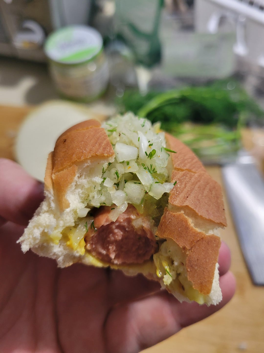 sooo after thinking about those dogs i had last night all day due to the nature of onion sweat piercing the air around me…i need some more for lunch but i added chopped dill and seasoned salt with a dash of heinz 57…what a TREAT!