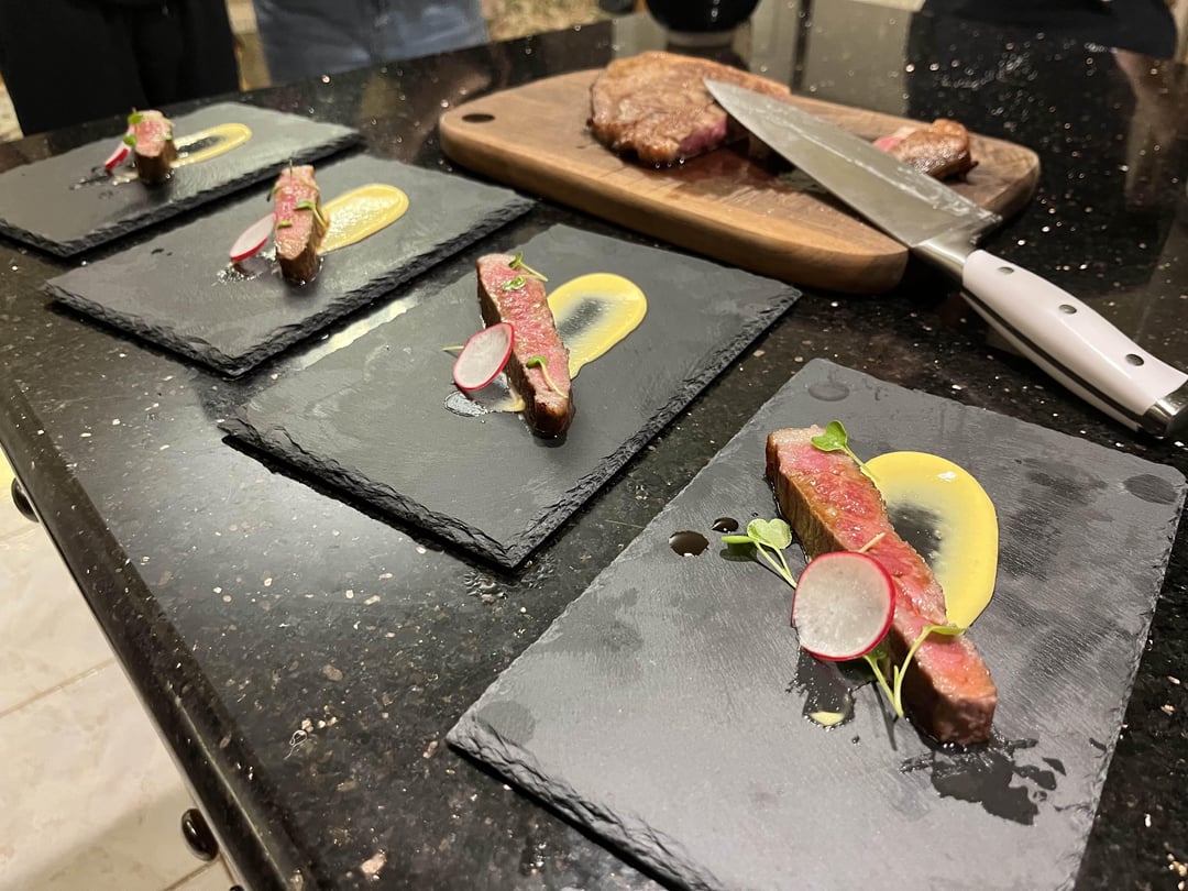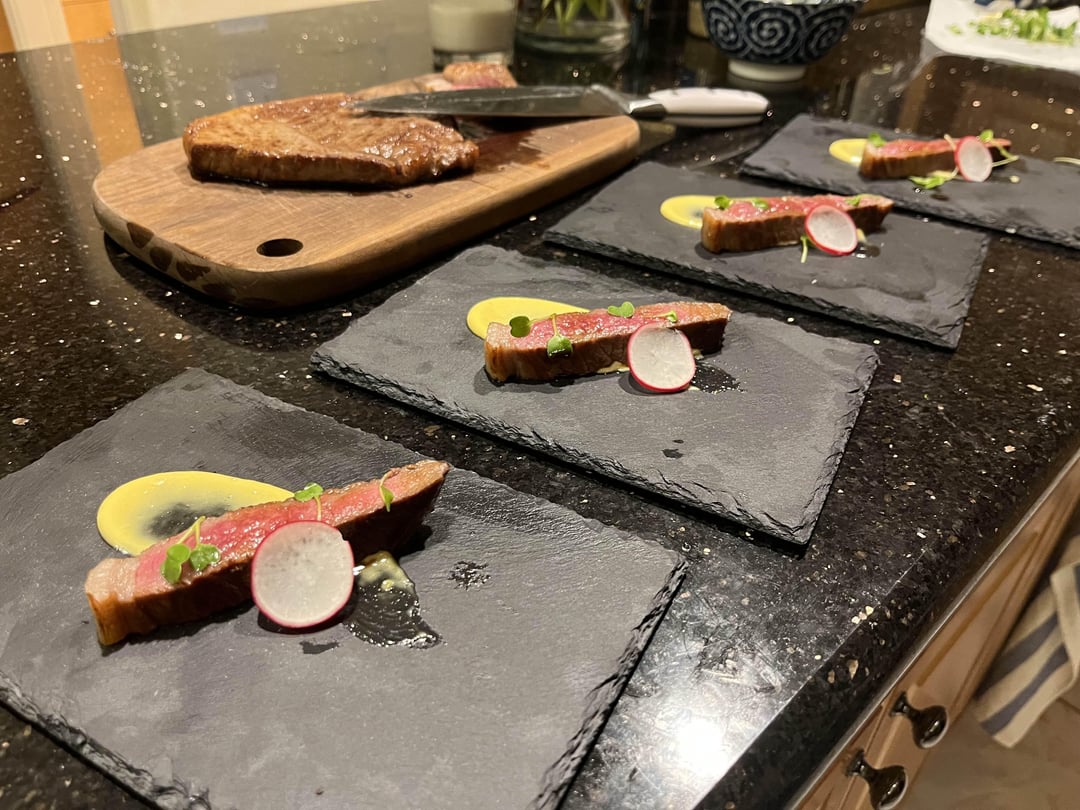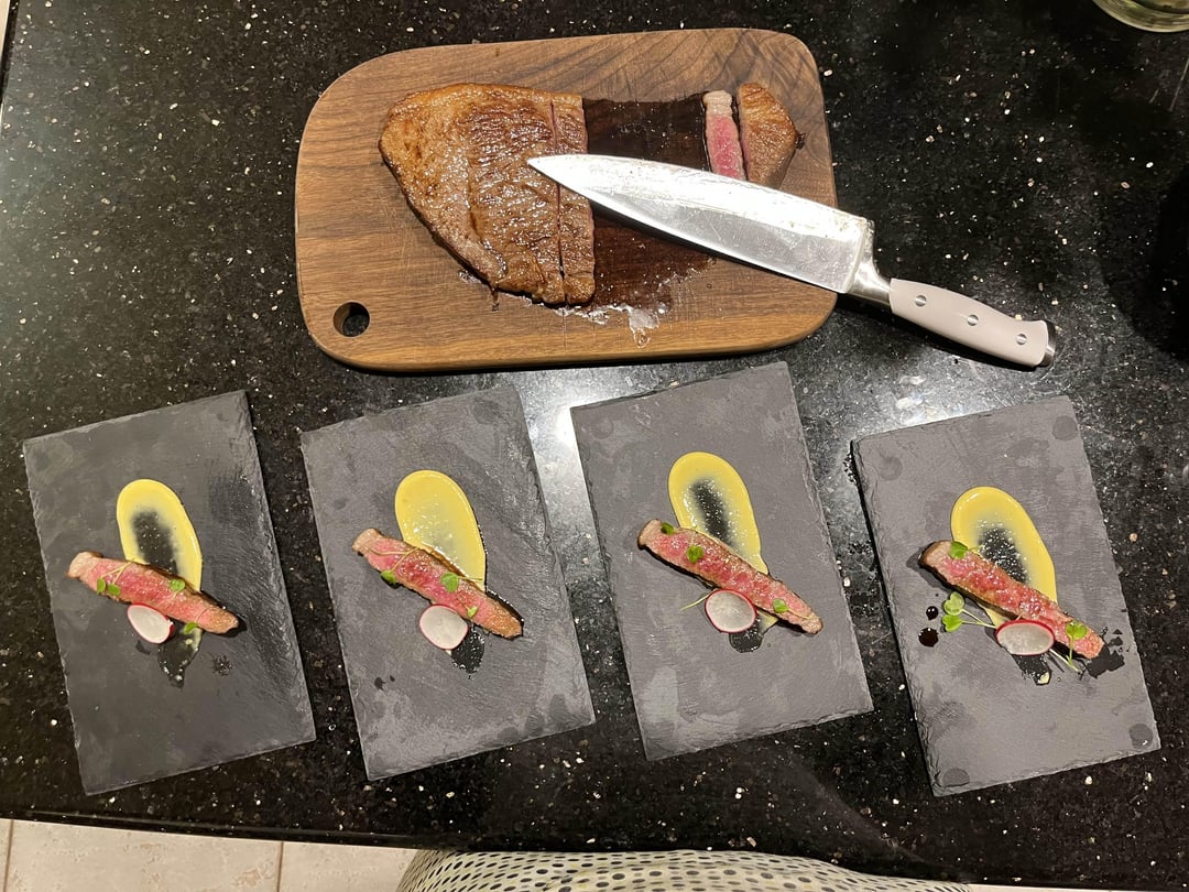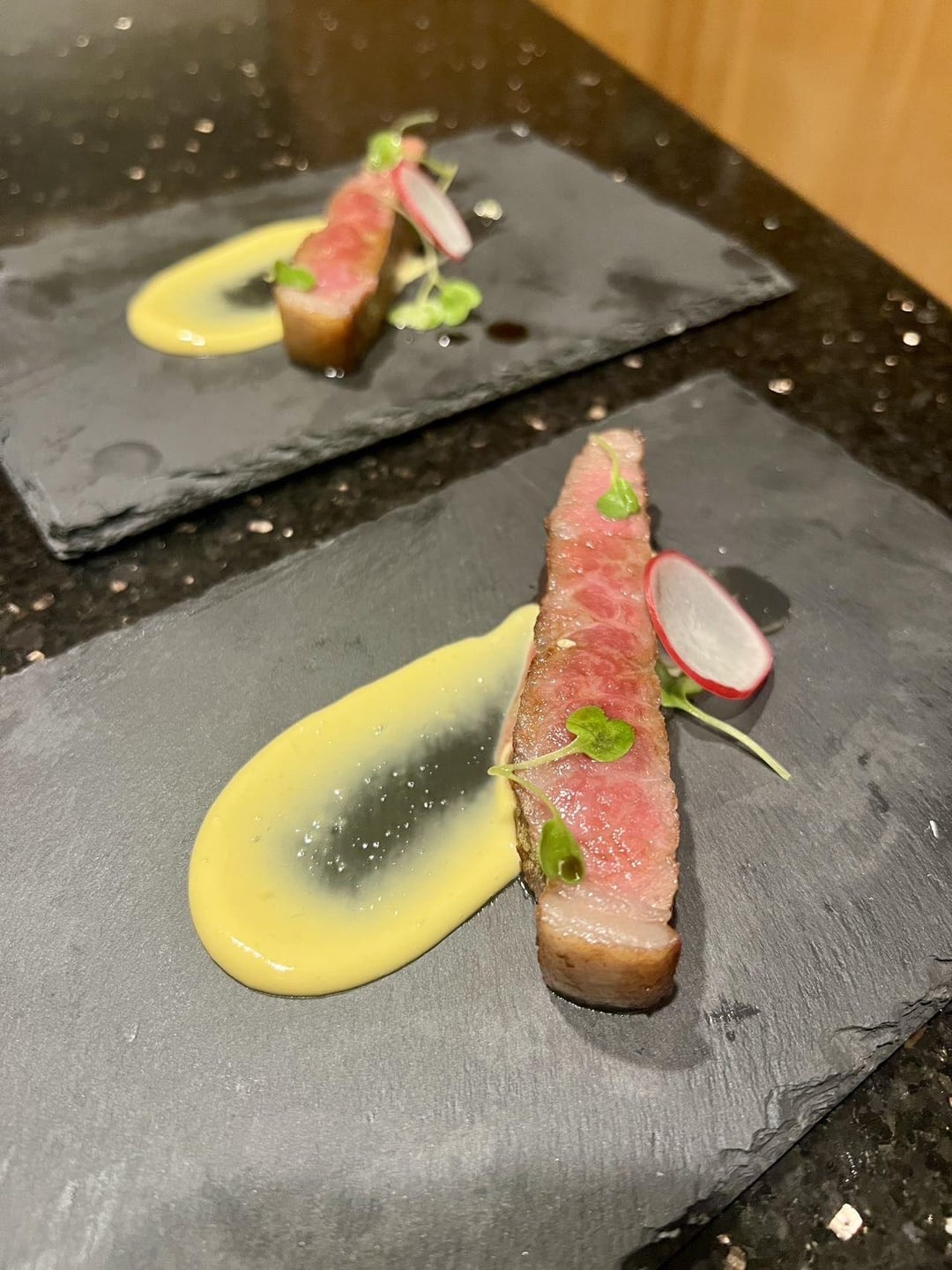 What a perfect way to serve waygu…. Beautiful. Love the plating.