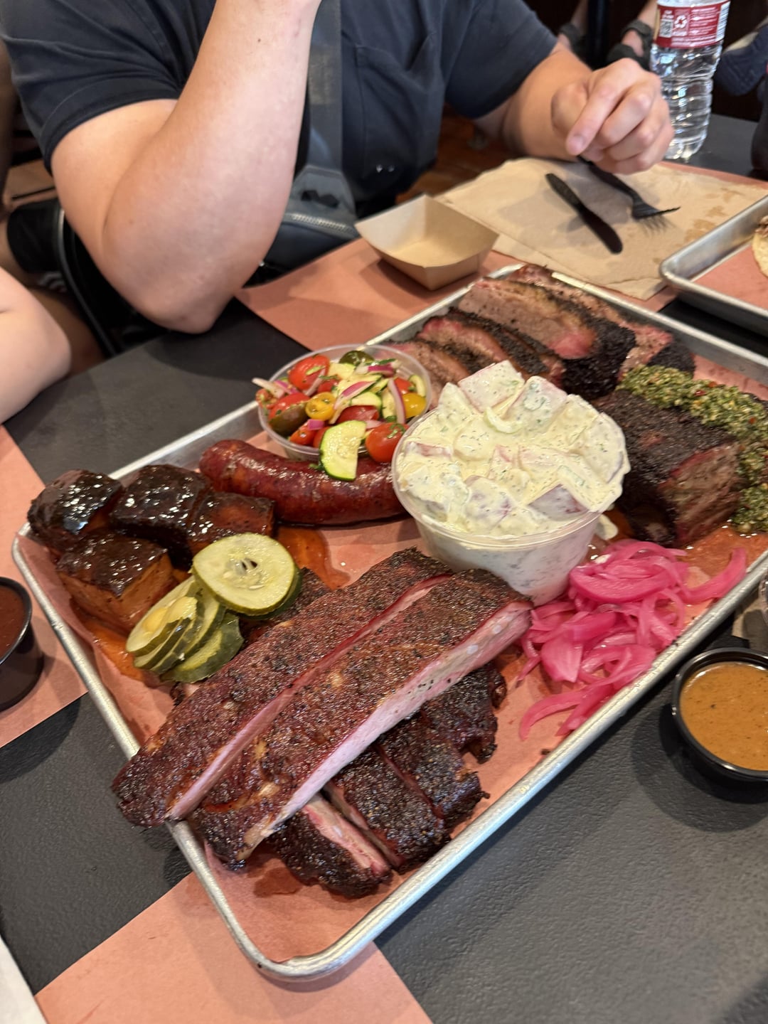 The brisket (pictured, fatty cut) was well seasoned but disappointingly super dry. The ribs were also dry and lacked seasoning. The sausage was a highlight. It was packed with flavor and well balanced. The pork belly had good smoke and flavor but was very chewy and tough when I was hoping for that melt-in-your-mouth texture. The beef ribs were excellent, but it was hard to fully enjoy them given how uneven the rest of the meal was.