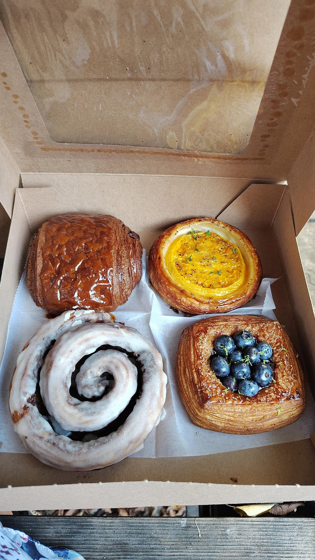 Chocolate croissant, heirloom tomato pastry, cinnamon roll and blueberry lime pastry