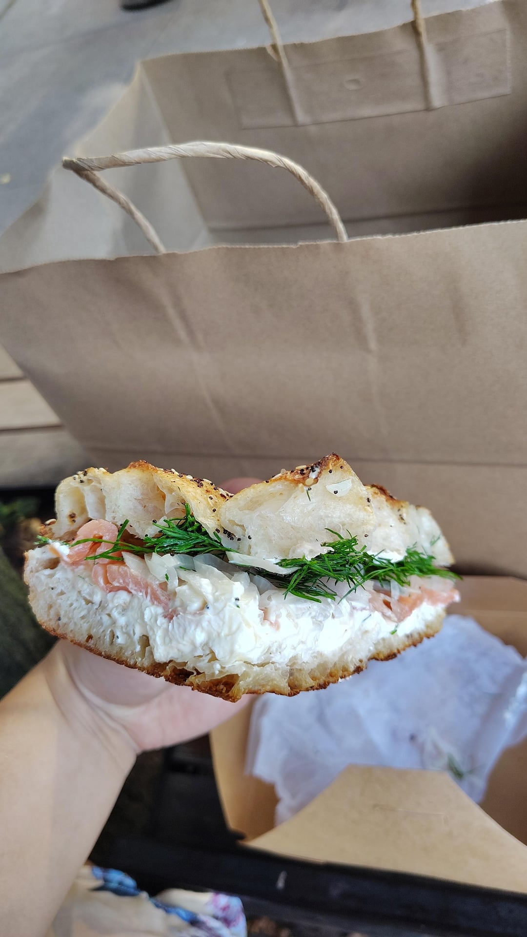 Smoked salmon, cream cheese, onions and dill on everything focaccia