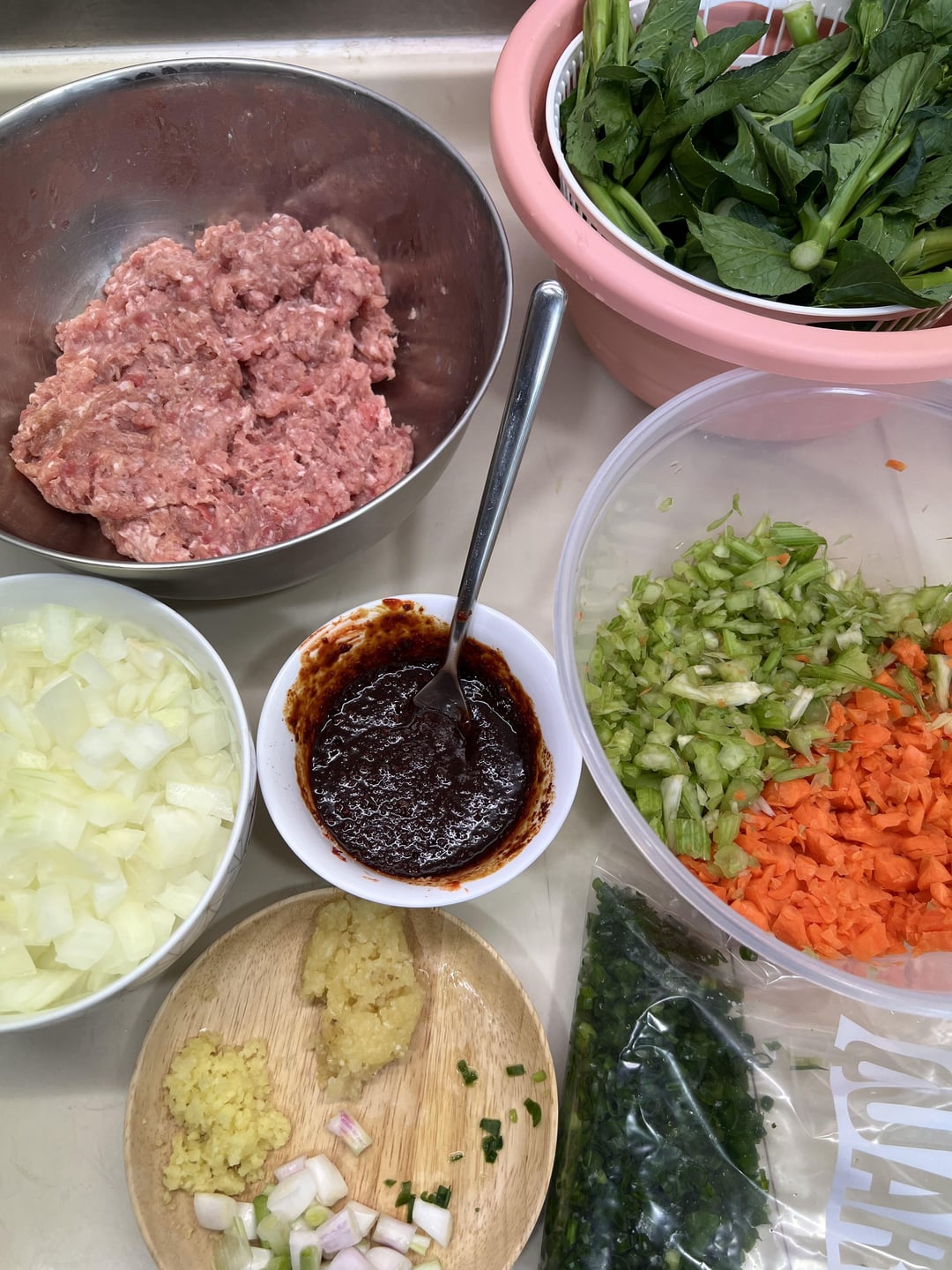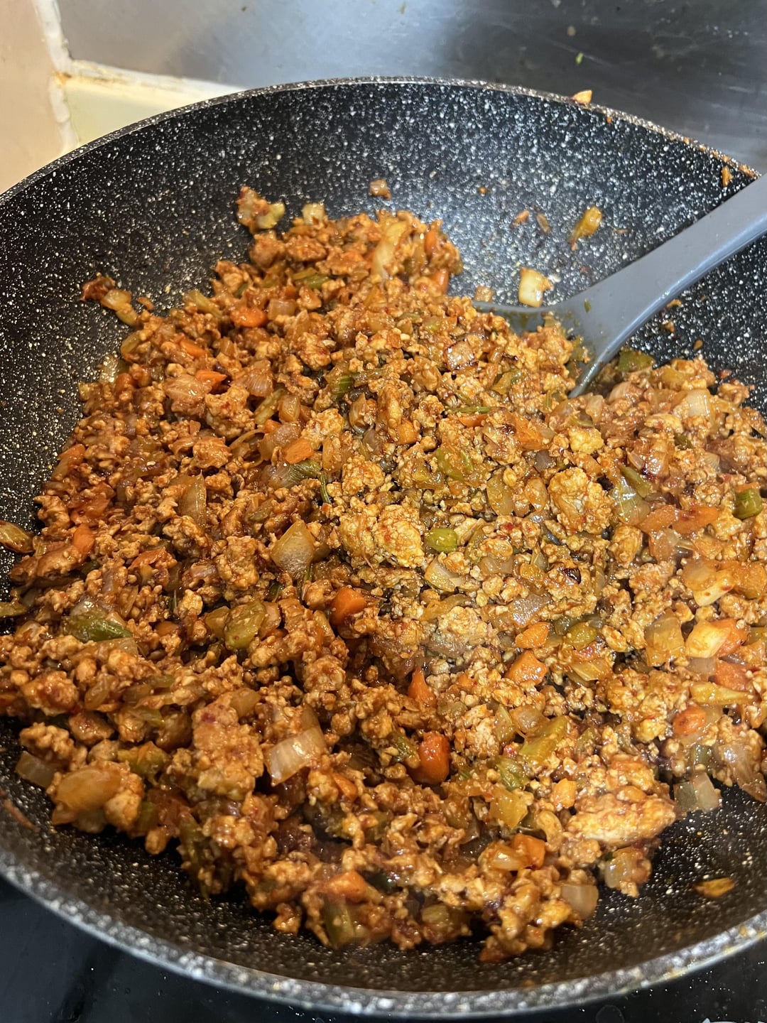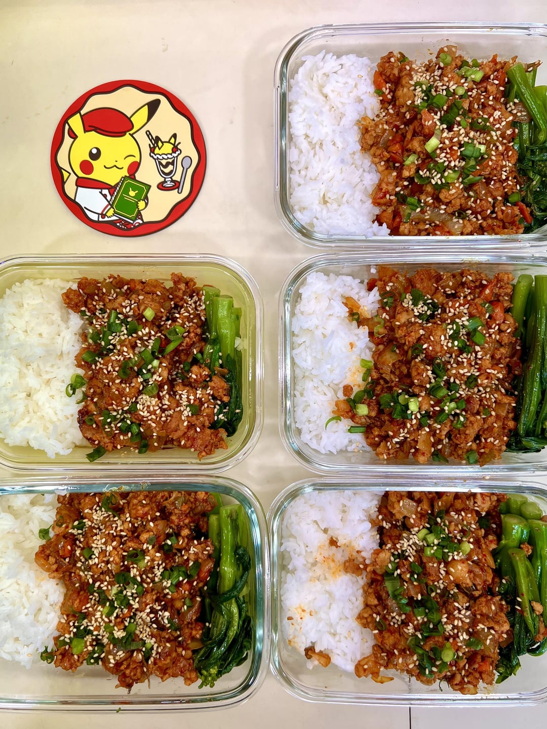 – 1kg minced pork marinated with some cornstarch, cooking wine and soy sauce – Diced onions, carrots, and celery (can completely skip the celery – doesn’t match this dish but I had leftovers) – Diced scallions (separate whites/greens) – Minced garlic and ginger – Prepared sauce of gochujang, gochugaru, soy sauce, mirin, and sugar – Browned minced meat and removed after 6 mins – Cooked onions/carrots/celery and added garlic/ginger/white scallions 6 mins – Threw minced meat back in and add sauce, keep cooking and mixing for around 4 mins – Drizzle toasted sesame oil at the end after turning off the stove – Garnish with green scallions and sesame seeds