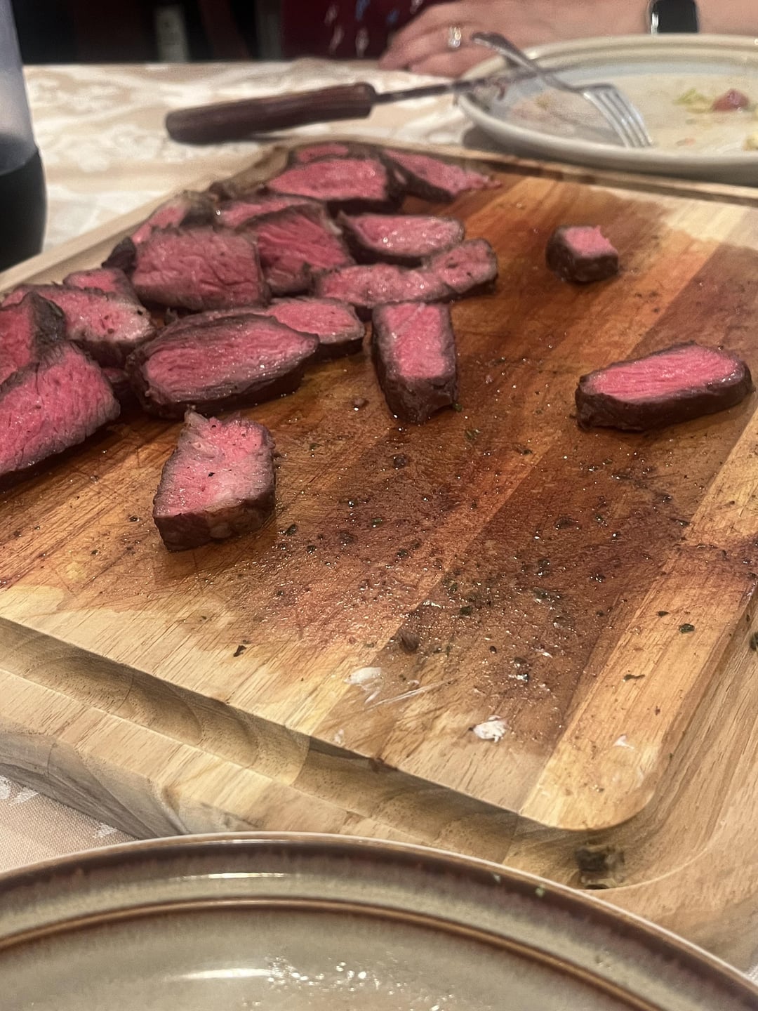 I don’t understand why everyone pre-slices the steaks now. You leave it whole so the temp and juices are peak at the time of consuming.