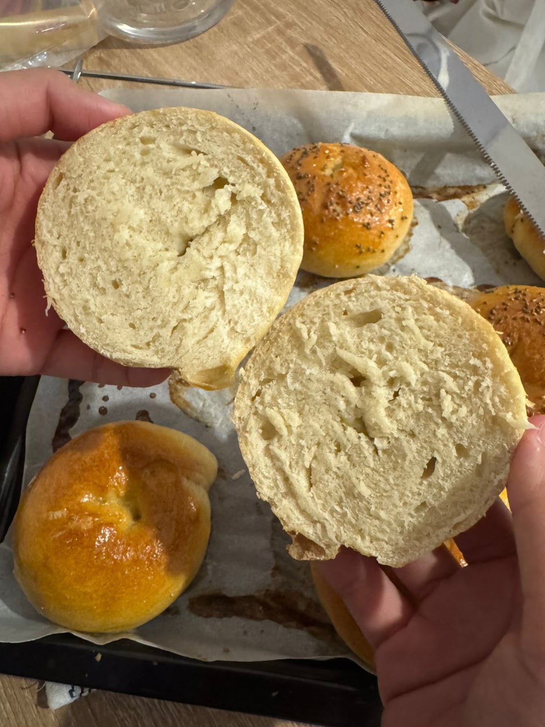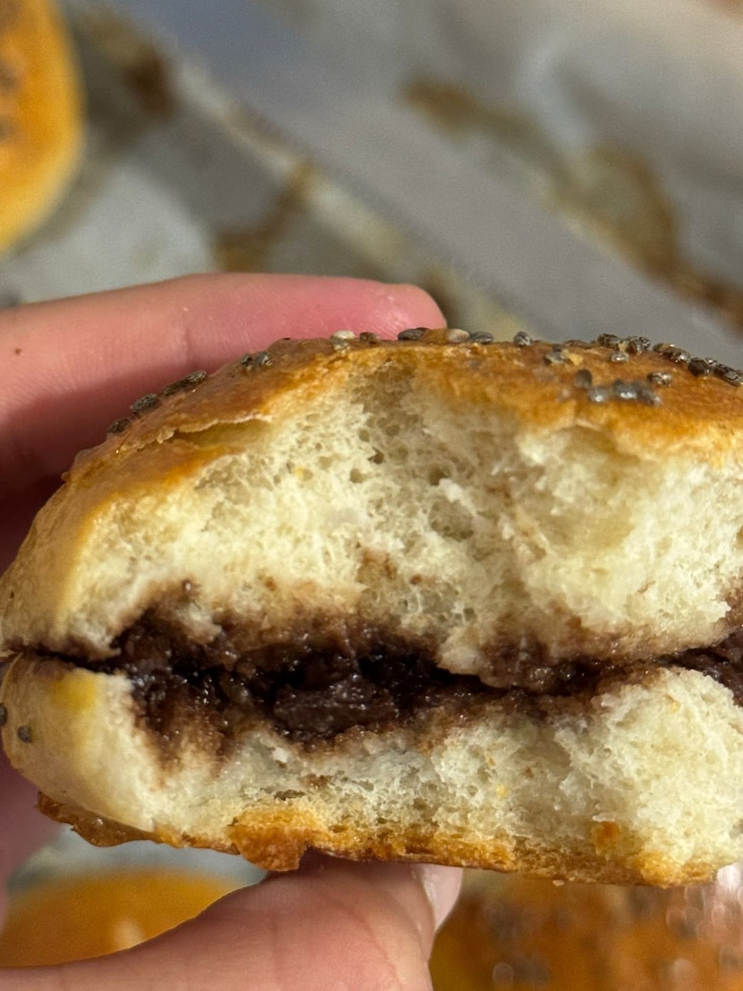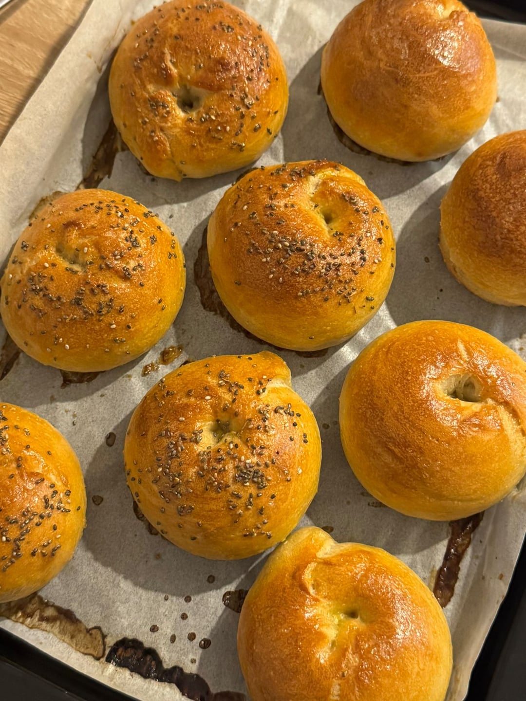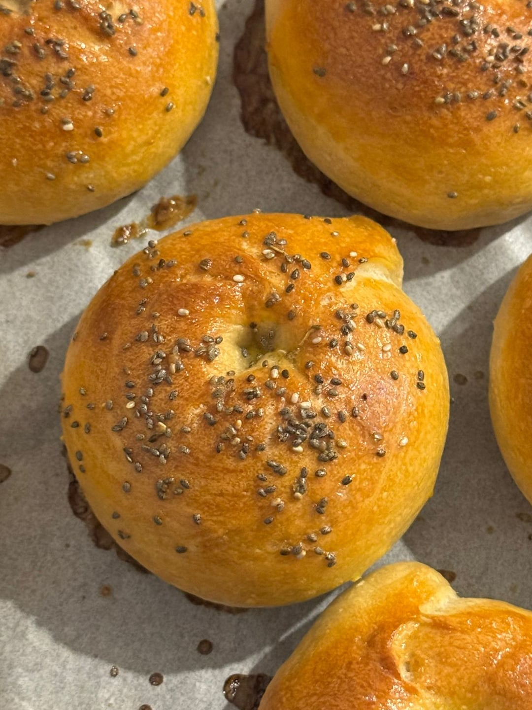 Came out not too bad. Holes are tiny to non-existent, now I know I need to make a bigger ring next time. The outside is nice crispy and inside soft, but it's on the denser side which is less airy. (Also, why the outside crispy? Felt like it was formed by the sugar that I used when boiling it. I don't remember having a crispy shelled bagels before 😂)
