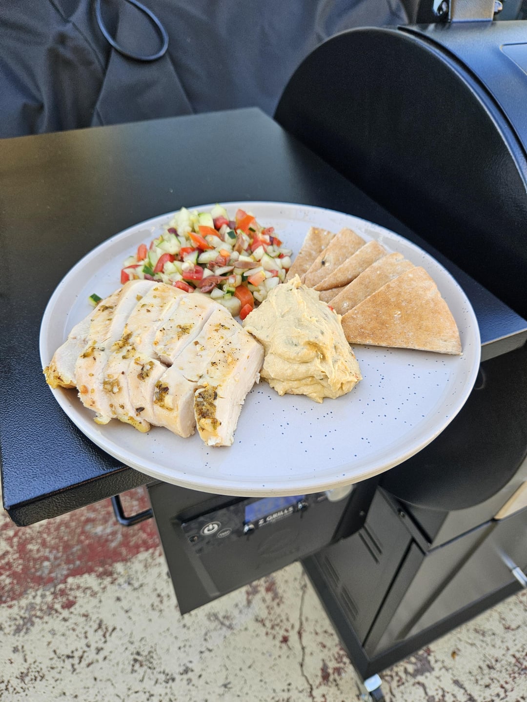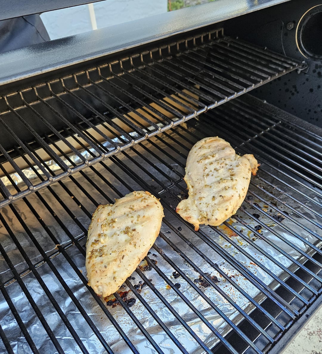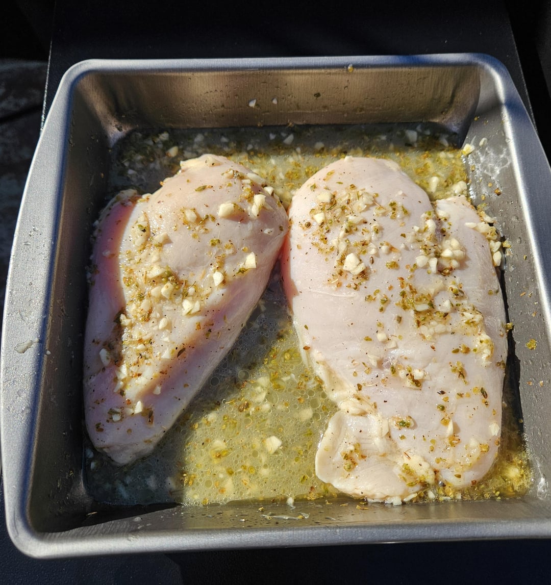 The chicken breast was marinated in Avocado Oil, Lemon, Garlic, and Oregano then grilled around 375 for 35 minutes or so.