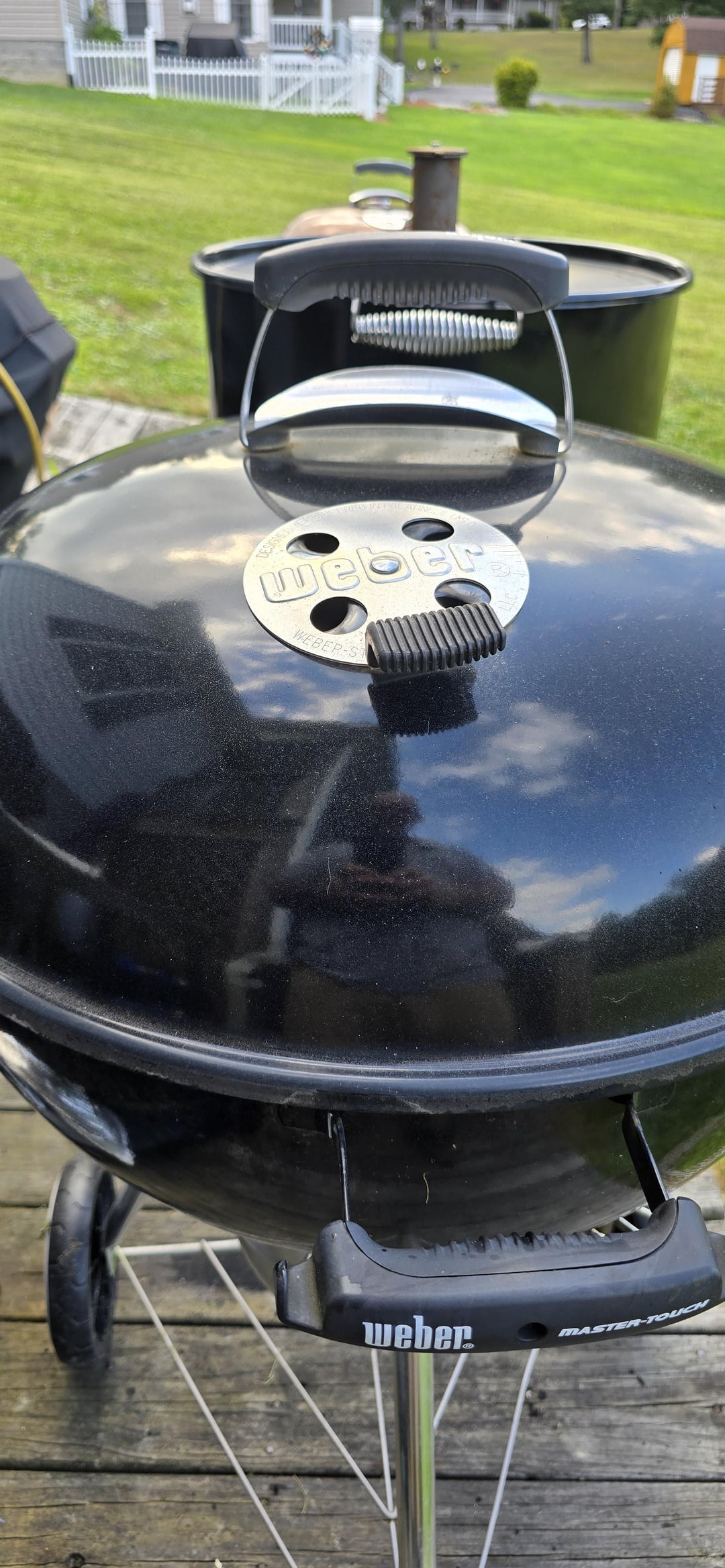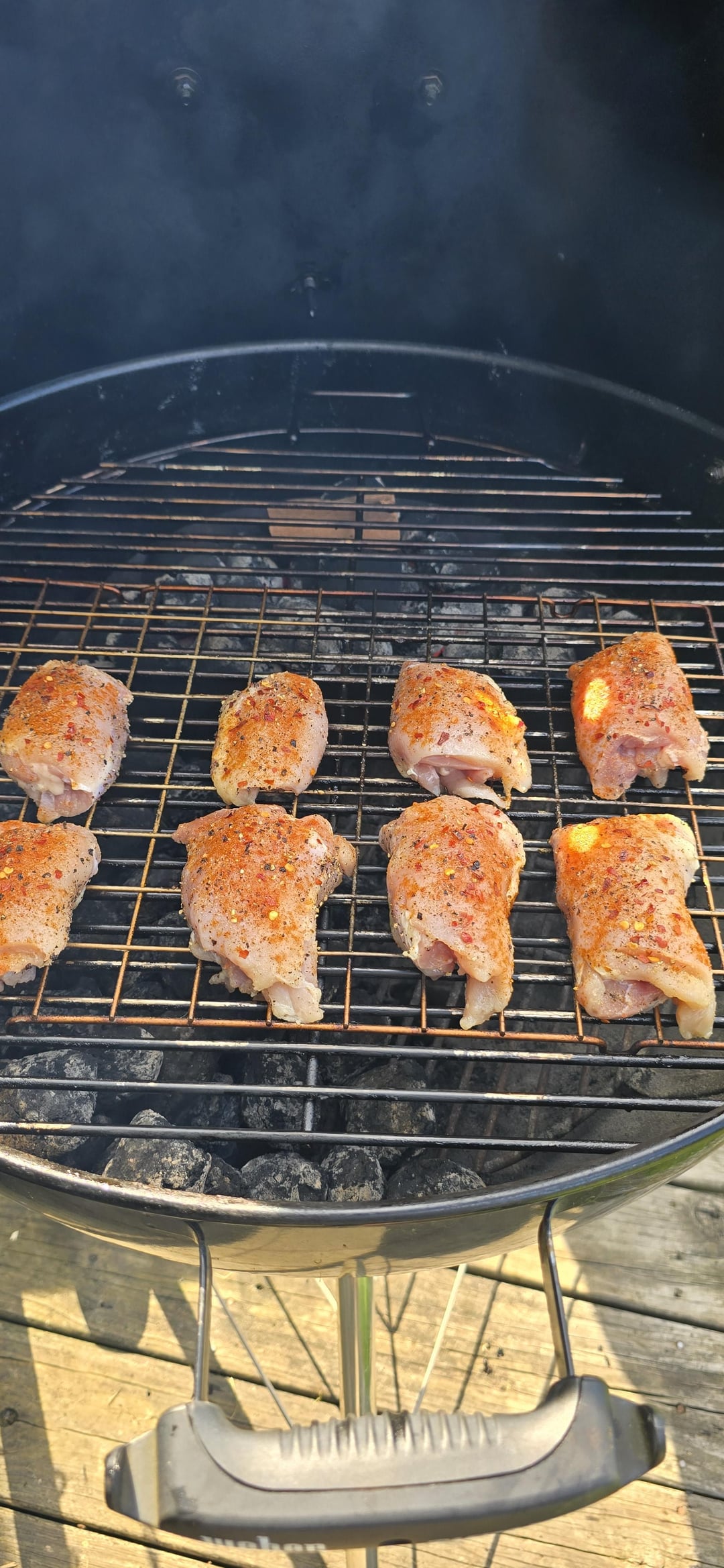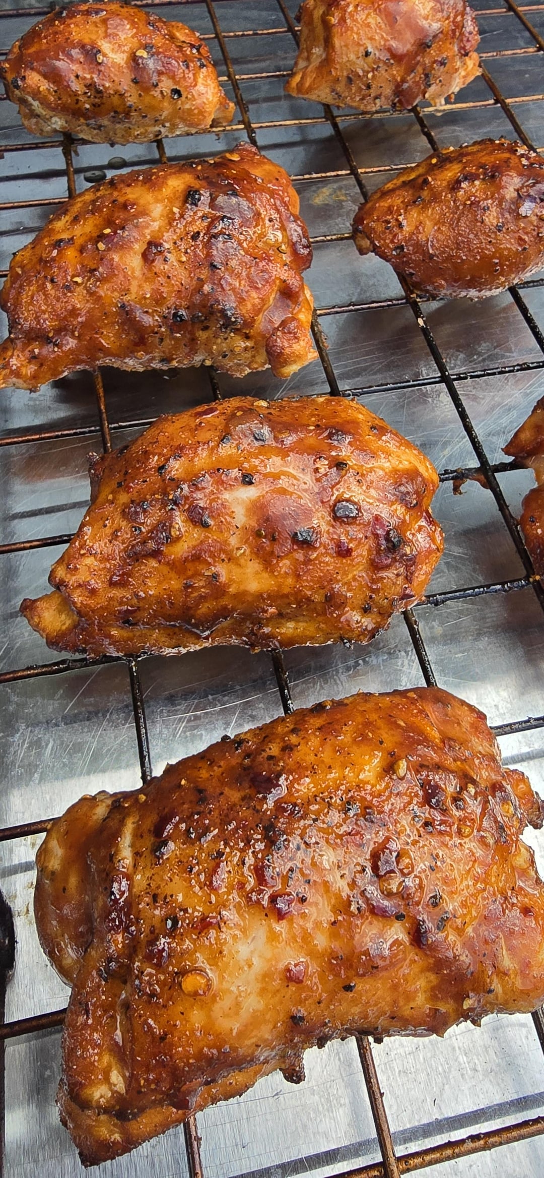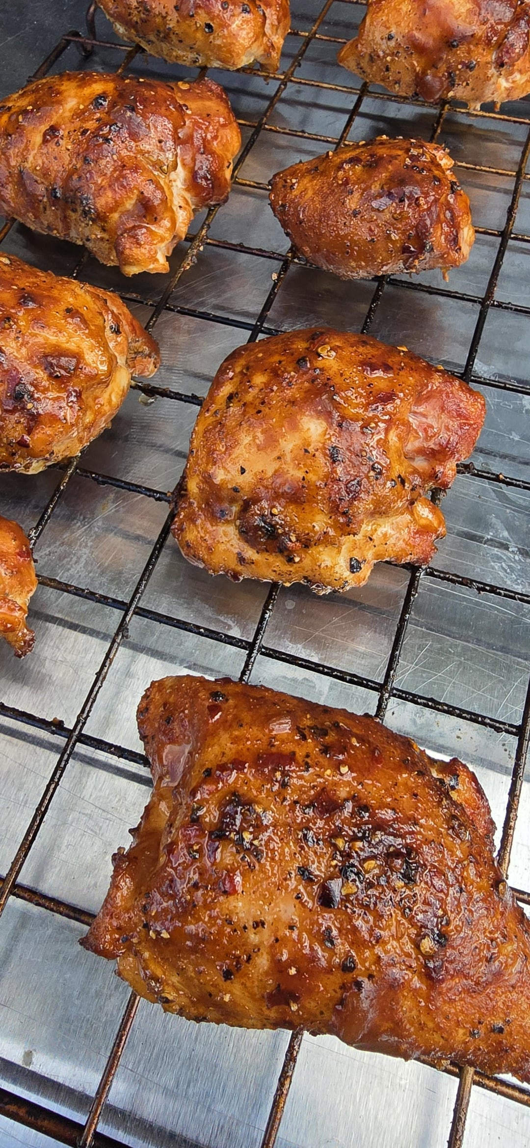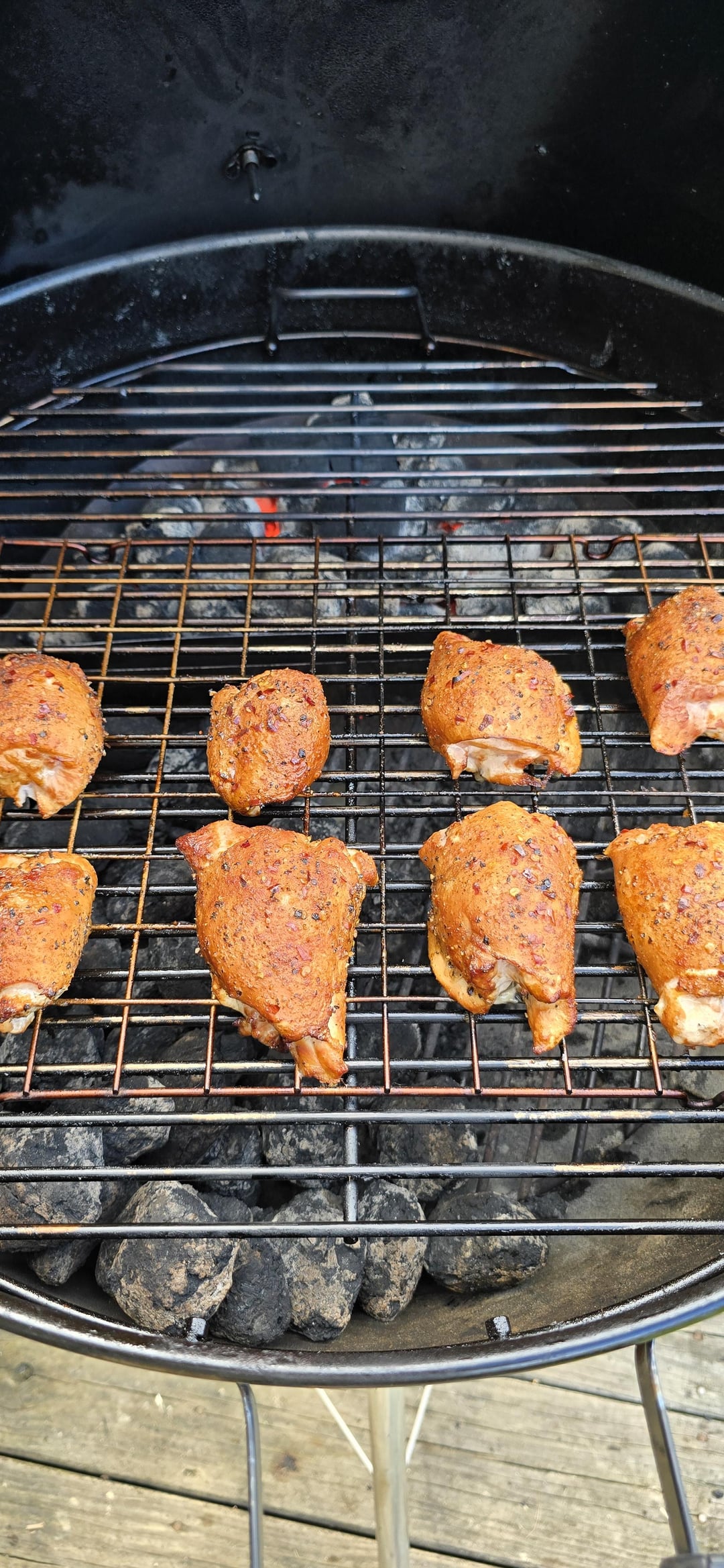 K.I.S.S. Keep It Super Simple -2 zone cook on Weber Master Touch -Boneless, Skinless, Chicken Thighs -Salt, Pepper, Garlic, Paprika, and Crushed Red Pepper -At 175°F IT, sauced with G Hughes Sugar Free Sweet and Spicey BBQ Sauce and Local Honey.. allowed to tack up. -Remove from heat, allow to rest for 15 minutes… and ENJOY!!!!!