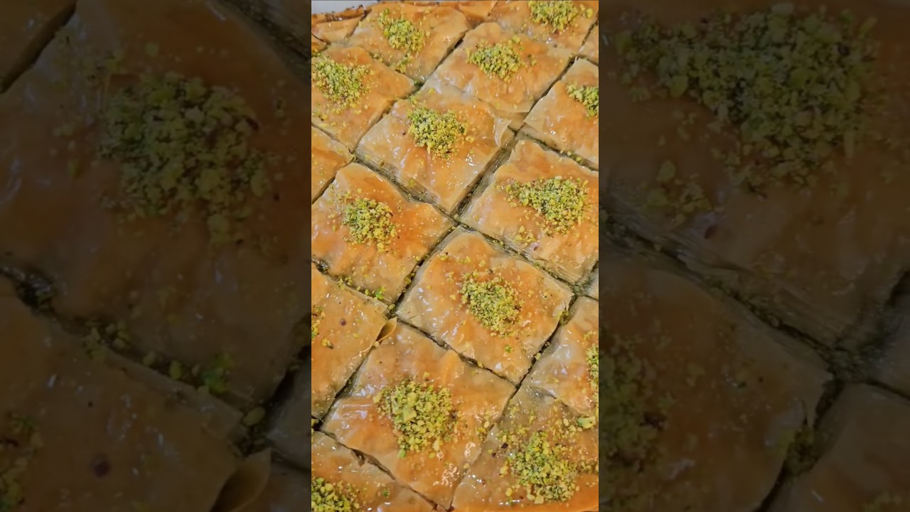 बकलावा खाने के लिए आपको तुर्की जाने की जरूरत नहीं है। आप इसे लेस एफर्ट्स में घर में ही बना सकते हैं। और हां, मैंने इसे फर्स्ट टाइम बनाया है और रिजल्ट आपके सामने है। इसे बनाना बहुत ज्यादा इजी है। सबसे पहले पिस्ताशियों का दरदरा सा पाउडर बनाएंगे। इसमें 1 टेबलस्पून कैस्टर शुगर या पाउडर शुगर थोड़ा सा सिनेमन पाउडर मिक्स करके साइड में रखेंगे। यह है फिलो पेस्ट्री या फिलो शीट्स। यह ईजीली मार्केट में मिल जाएगी। इस वजह से इसका प्रोसेस बहुत ज्यादा इजी हो जाएगा। कंटेनर के हिसाब से फिलो पेस्ट्री को कट करेंगे। इसके सेवन लेयर्स हमने लगाने हैं। हर एक लेयर के बाद हम मेल्ट किया हुआ देसी घी या बटर इसे ब्रश करेंगे। अब हाफ पिस्ताशो का मिक्सचर इस पे ऐड करेंगे। उसके बाद हमने अगेन सेवन लेयर्स लगाने हैं और अच्छे से देसी घी से ब्रश करते जाना है हर एक लेयर के बाद। सेवन लेयर्स होने के बाद हम इस पे फिर से पिस्ताशू की एक लेयर लगाएंगे। उसके बाद हमने फाइनल सेवन लेयर लगाने हैं। इसमें भी अच्छे से हमने इसे देसी घी से अच्छे से ग्रीस करना है। उसके बाद इसे कट करेंगे मनचाई शेप में ऊपर से और थोड़ा मेल्टेड देसी घी डाल के इसे 180° सेल्सियस पे 40 टू 45 मिनट्स के लिए बेक करेंगे। शुगर सिरप के लिए 1/2 कप शुगर, वन कप वाटर डाल के इसे 5 मिनट के लिए बॉईल करेंगे। लास्ट में थोड़ा सा नींबू का रस और थोड़ा सा रोज वाटर डाल के मिक्स करेंगे। गरमा गरम बेक्क बग लावा पे ल्यूक वार्म चाशनी ऐड करेंगे और इसे अच्छे से सोक होने देंगे। 2-3 घंटे का रेस्ट देने के बाद यह हमारा बकलावा खाने के लिए रेडी