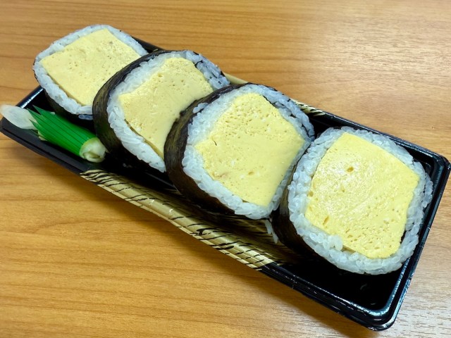 This unusual roll comes from Kappo Sushi Kisaragi, a popular restaurant in Toyota City, Aichi Prefecture. A pack of four costs 1,080 yen (US$7.31), with each slice presented beautifully, showing the craftsmanship involved in its simplicity.