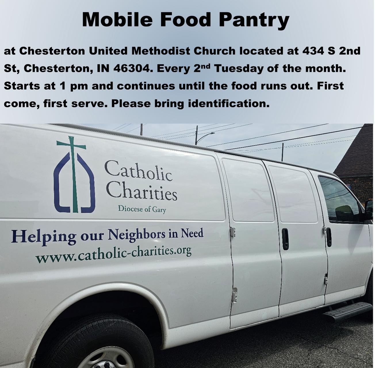 The Catholic Charities Mobile Food Pantry visits Chesterton United Methodist Church at 1 p.m. the second Tuesday of every month.