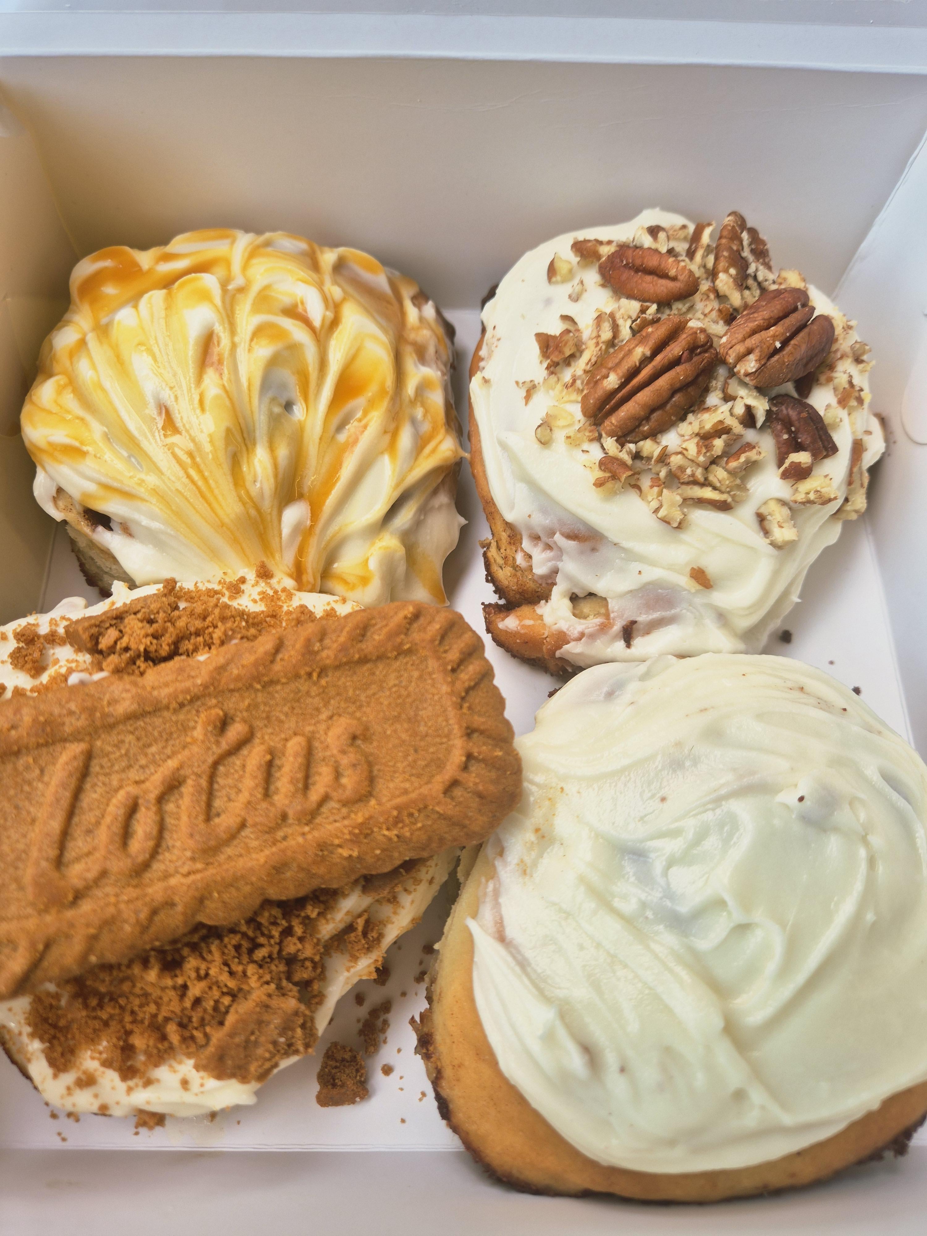 Be clever with your flavors. For example, I see you have caramel sauce. So you can do a salted caramel roll, a turtle candy roll, a German chocolate cake roll, a caramel apple roll, a sticky toffee pudding roll… And all of those things are basically your caramel sauce plus a couple of simple additions. Always be thinking about how to get the most amount of overlap between recipes but with the maximum amount of “difference”, if that makes sense. Especially for complicated elements that you are making yourself, like a caramel sauce. And you can double batch it, freeze it for next week, and so on, so you are not boring your customers with an entire week of only caramel.