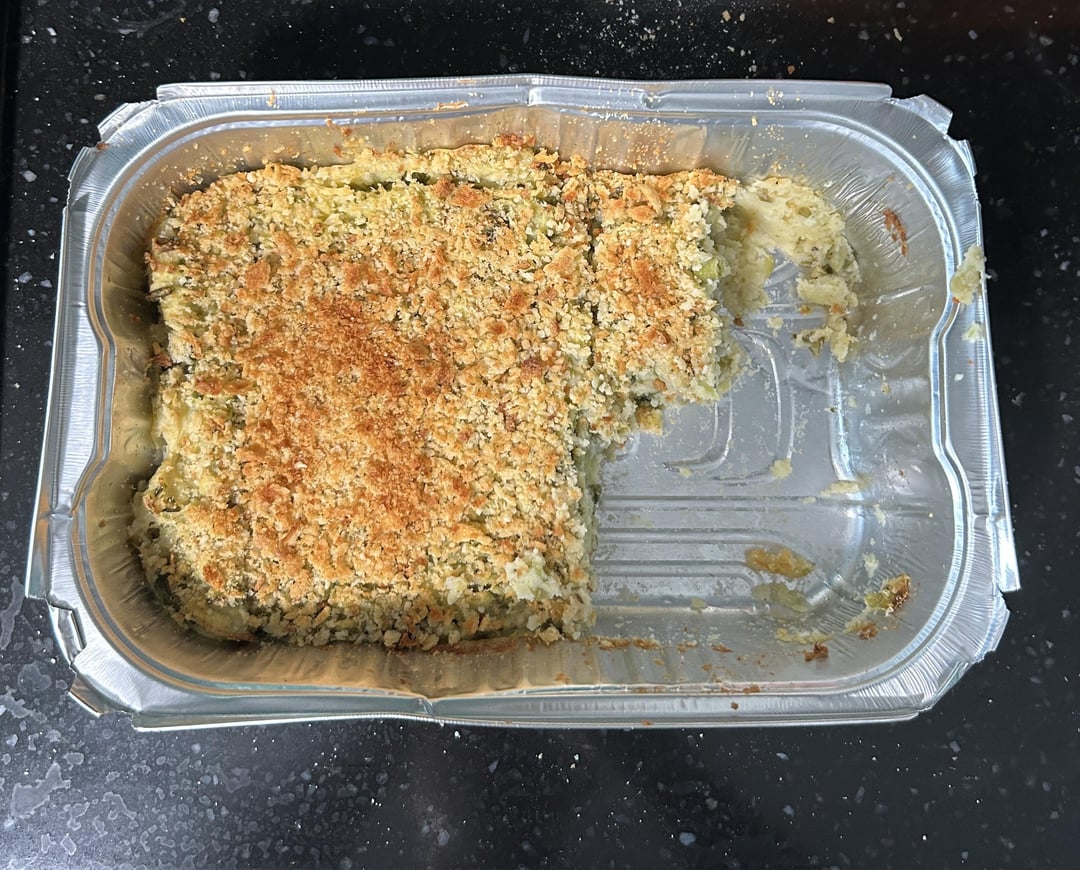 I buttered the baking tray and put the mixture into it, spreading it evenly and topping it with some breadcrumbs.