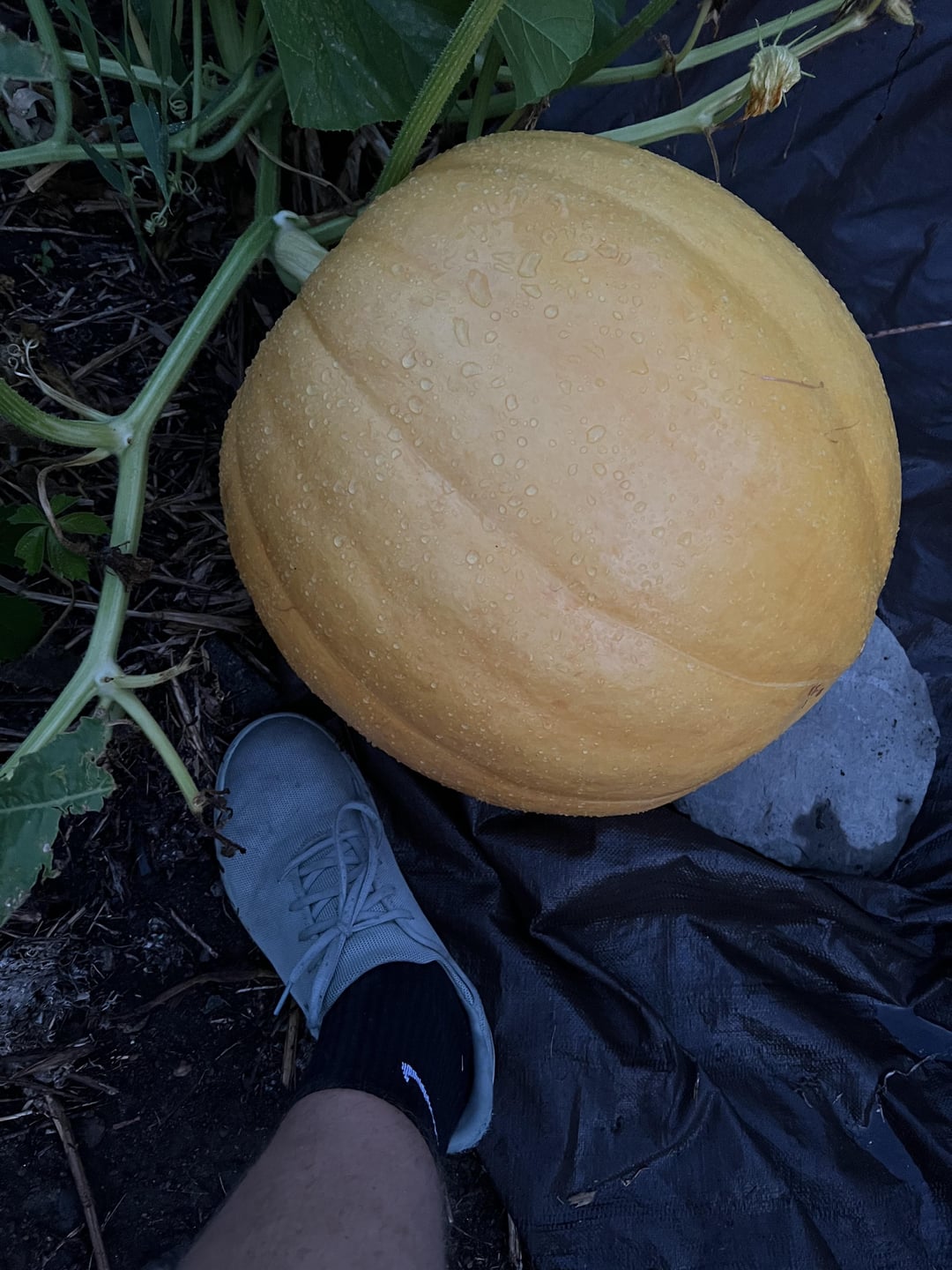 These “giant jack o lantern” pumpkins were off to a slow start due to a cold spring and I thought none would be ready by the fall but look at this chunk! My size 13 foot for scale lol. My first time trying pumpkins! 🤩