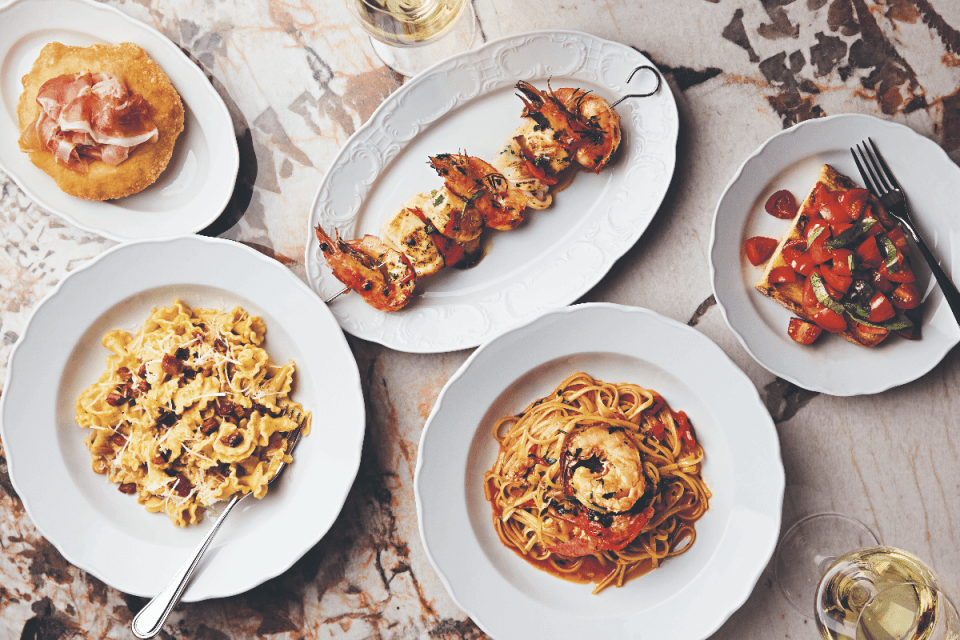 Campanelle restaurant: we ate a thwacking great kilogramme of meat with a lovely pinot noirThe carbonara on the bottom left, surrounded by prawns, bruscetta, seafood pasta and aged meat