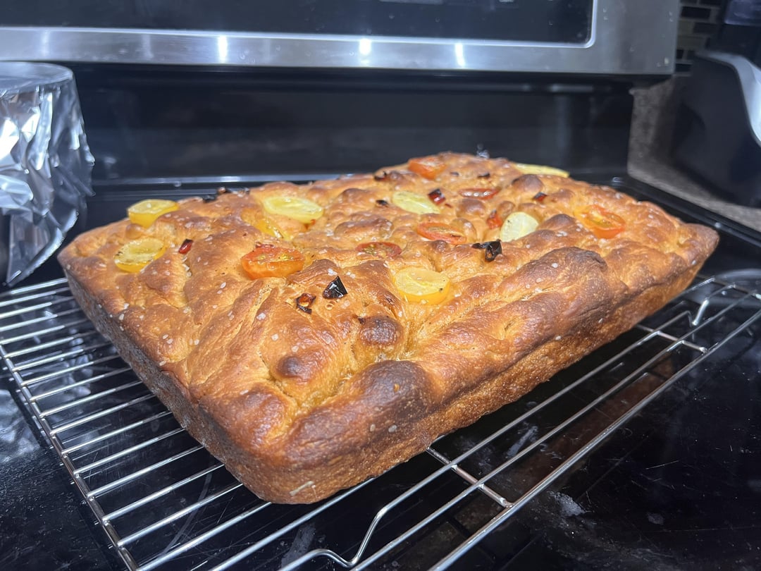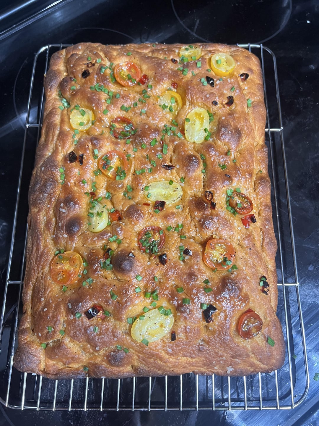 Made a gochujang focaccia with chili oil and gochujang. Topped with heirloom cherry tomatoes, thai chili's, and chives.by _dhart Dining and Cooking