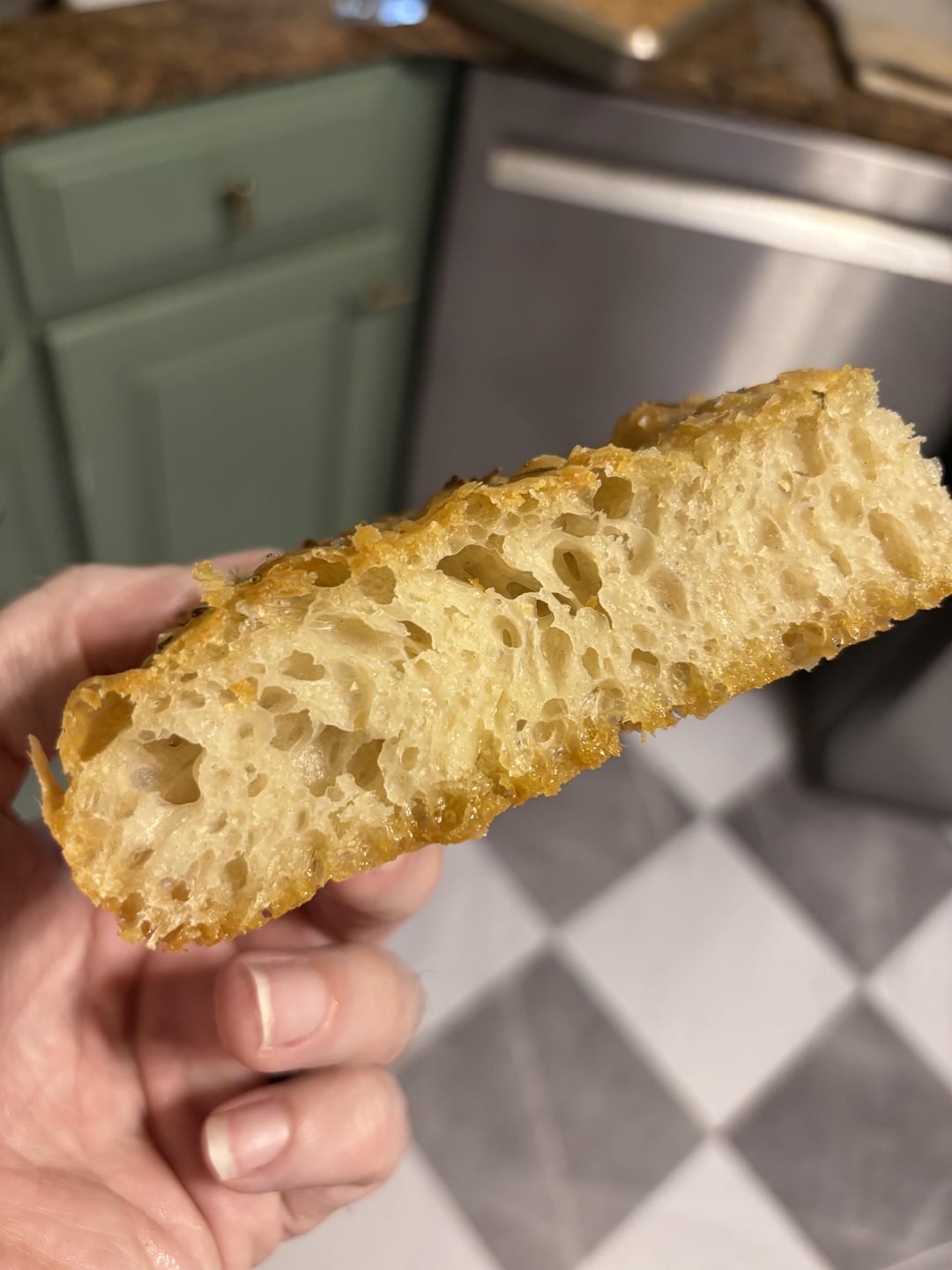 The crumb is the best I’ve achieved yet. It came out thinner than I had expected but I’m not upset! Using this to make fried eggplant sandwiches with fresh mozzarella, basil, and balsamic glaze.