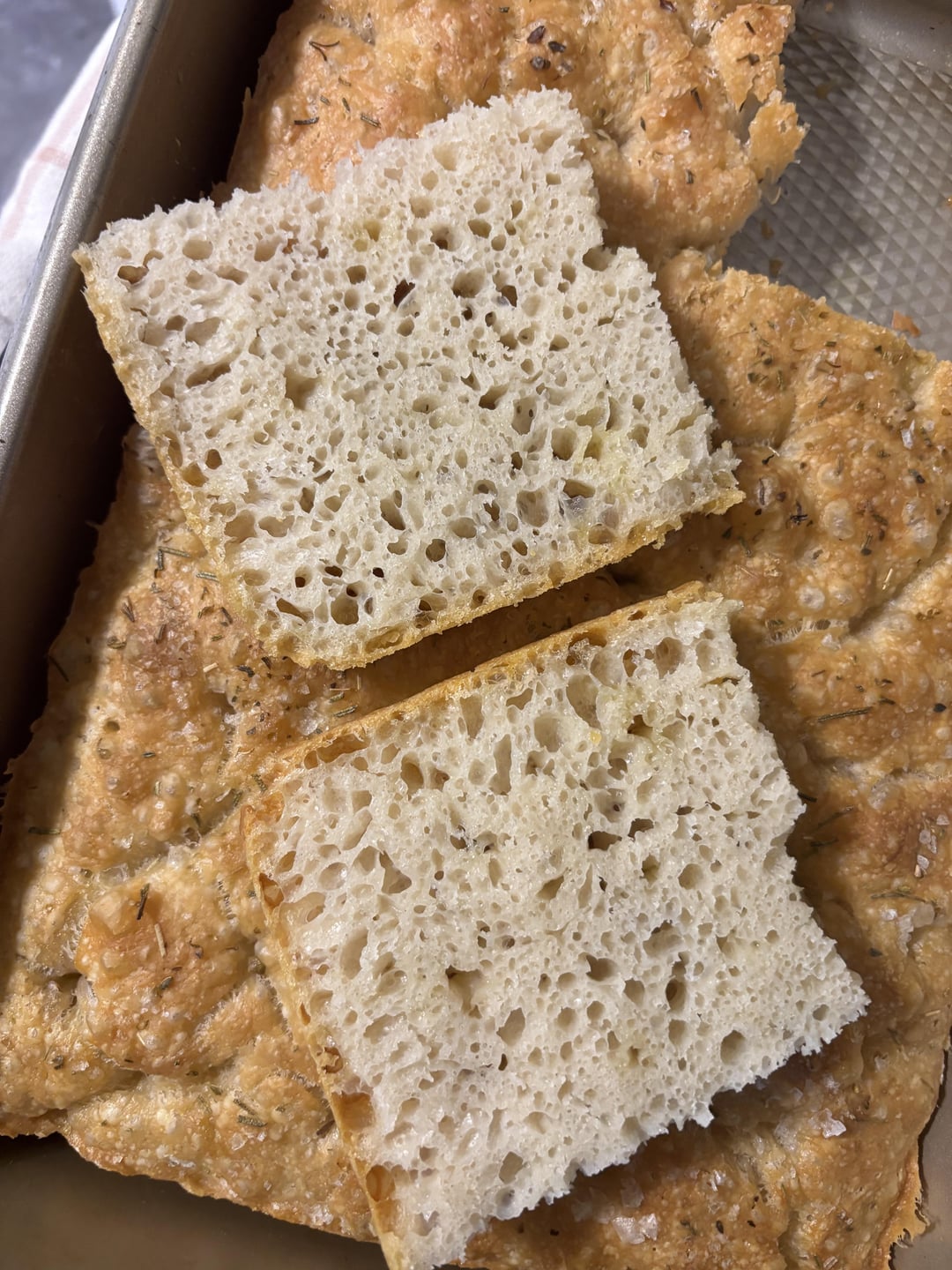 Focaccia #4 is in the books. 4 cups of bread flour, 2.25 tspn of active dry yeast, and I went with a 65% hydration since the prior loafs were so firm at 50%. What a difference- the dough was much more wet, proofed for 72 hours in the fridge with a modest rise, 4 hours proofing in the pan, baked at 450° for 30 minutes.