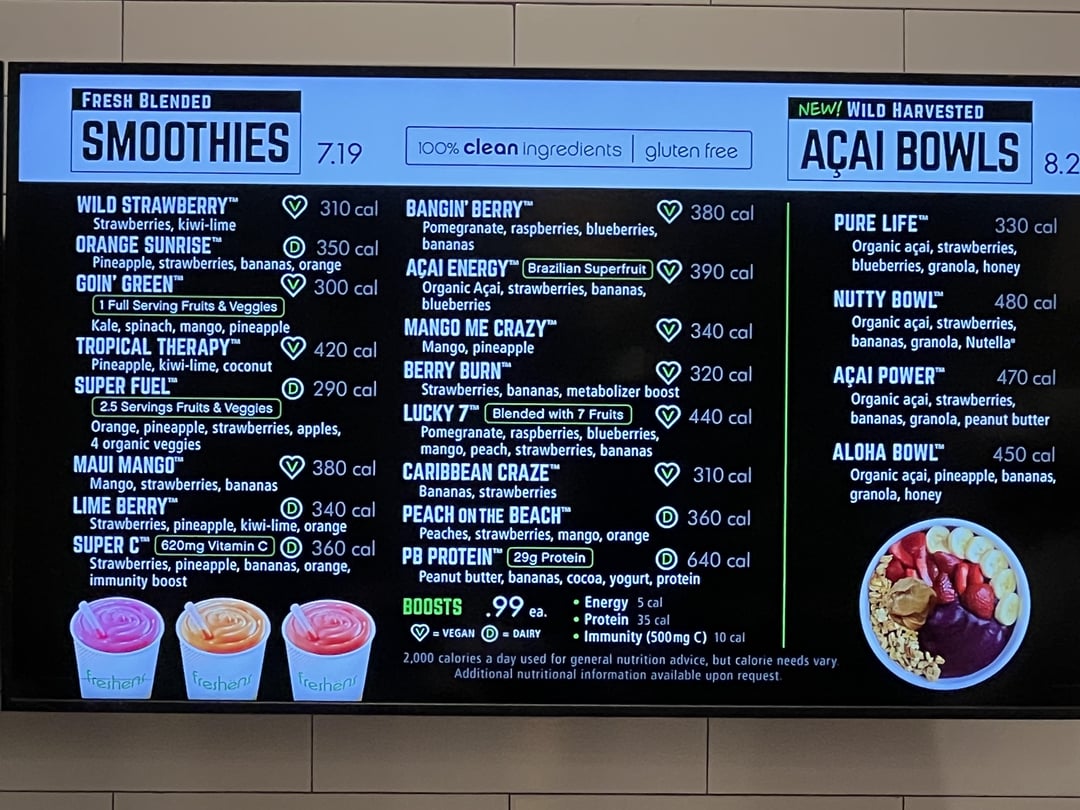 Caribbean Craze smoothie (bananas and strawberries) with additional protein. The size of the cup is 24oz and according to google, is about 370-600 calories. I’m feel very full going through almost half of the cup, I didn’t struggle finishing a costco banana strawberry smoothie and that one is 320 calories