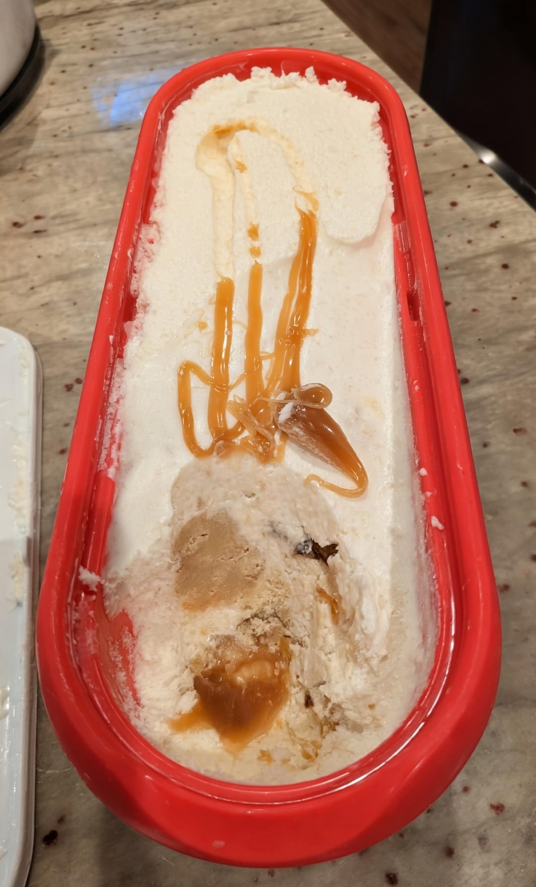 Final steps were to layer ice cream, then a little caramel sauce, cake pieces and candied pineapple, then ice cream and repeat until the container was full. Drizzled a little caramel on top and then froze for a few hours to set.