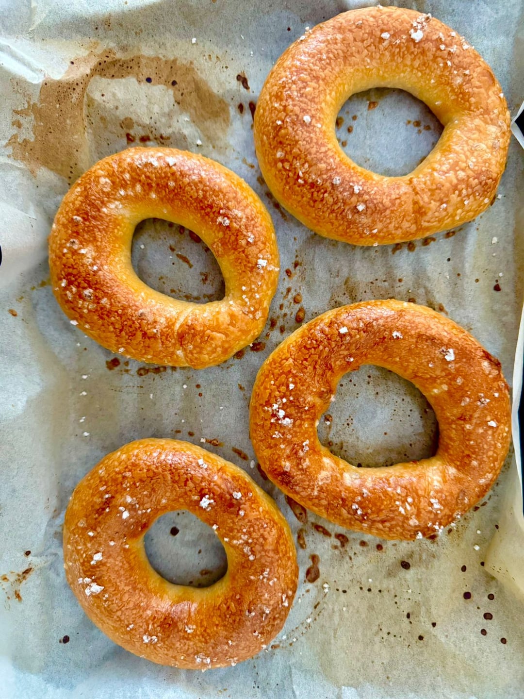 This round bagels, I don't use poolish tho. Just straight up activate the yeast in lukewarm water and mix with flour to make bagel dough. Made 2 types of bagel, plain and add salt flakes on the top, for someone who love salty, the salt flakes is the besttðŸ˜ðŸ©·