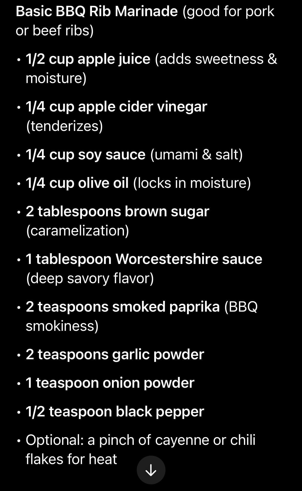 Thoughts on this marinade for bbq ribs?by QuartzPO 5 Comments Murdy2020 4 months ago Taste looks great. Maybe more brown sugar. And, I’m not sure the olive oil is going to serve its expressed purpose. WellOkayMaybe 4 months ago Sub half the apple cider vinegar with orange juice. Thank me later. Mgroppi83 4 months ago IMO, the olive oil is not necessary. And even with the soy sauce, I would add kosher salt as well. Mitch_Darklighter 4 months ago It reads like AI slop. The olive oil is absurd, and that’s a ton of soy sauce for “Basic BBQ” Spare-Locksmith-2162 4 months ago Add some celery seed or celery salt.